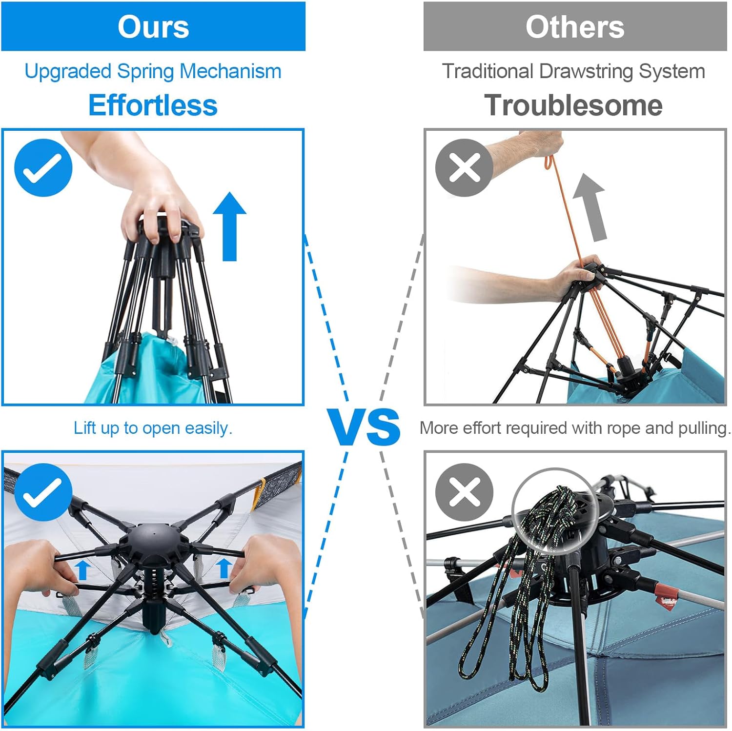 - Easy Setup & Super Stable: The specially designed spring opening system shows an industry-leading level of improvement. One person can set up the beach tent easily in seconds. Compared to the drawstring design, this one is faster, effortless, and saves more time. The 8.5 mm thick fiberglass poles make the tent stronger. Equipped with 3 sandbags, 4 wind ropes and 10 stakes to ensure stability and prevent it from being blown away in the wind.