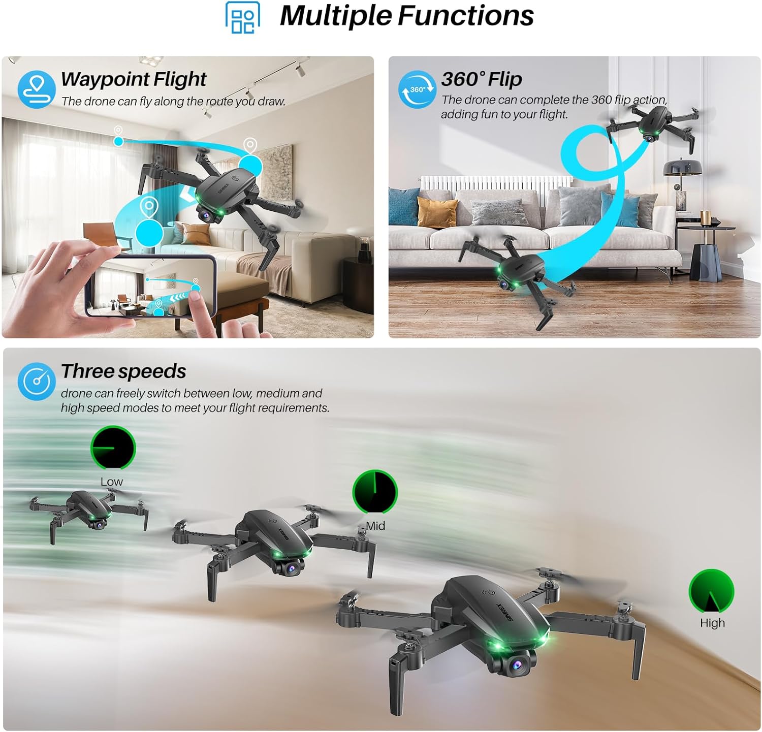 - [Multifunctional Drone] Enjoy intelligent features such as flying along a set path, gravity sensing, 360Β° flips, headless mode, and 3-speed adjustment for easy control.