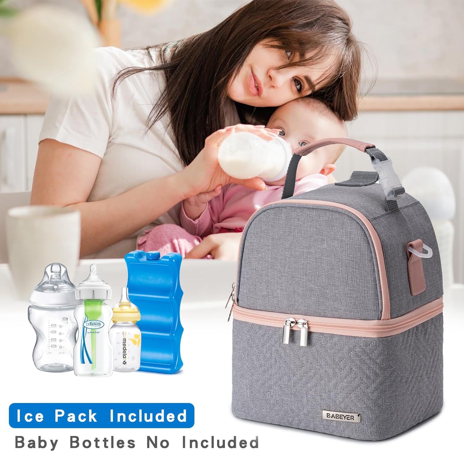 Breastmilk Cooler Bag with Ice Pack Fits 6 Baby Bottles up to 9 Ounce, Breast Milk Pump Cooler Bag with Shoulder Strap for Nursing Mom Daycare, Work, Travel- Grey