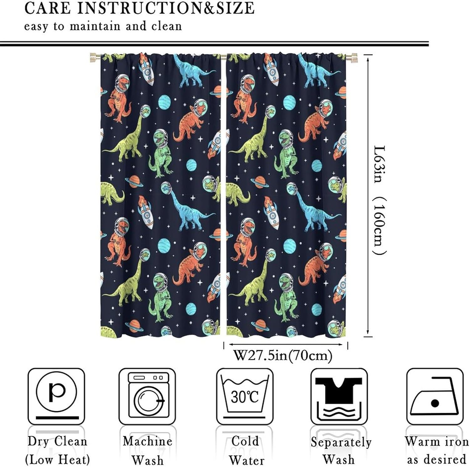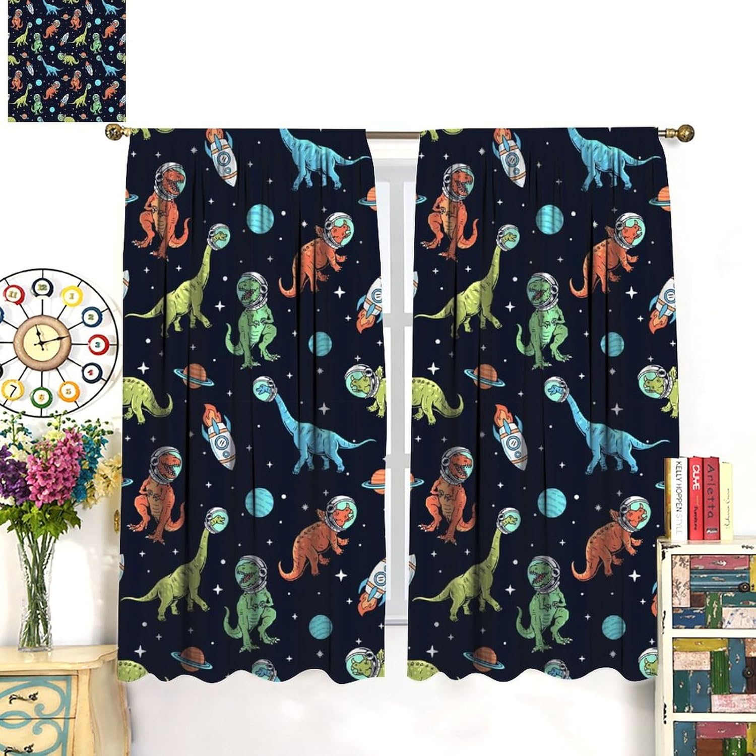 Cartoon Dinosaur Curtains for Kids Boys Girls Home Decor, Astronaut Rocket Funny Outer Space Blackout Rod Pocket Window Drapes for Bedroom Living Room W27.5xL63in 2 Panels