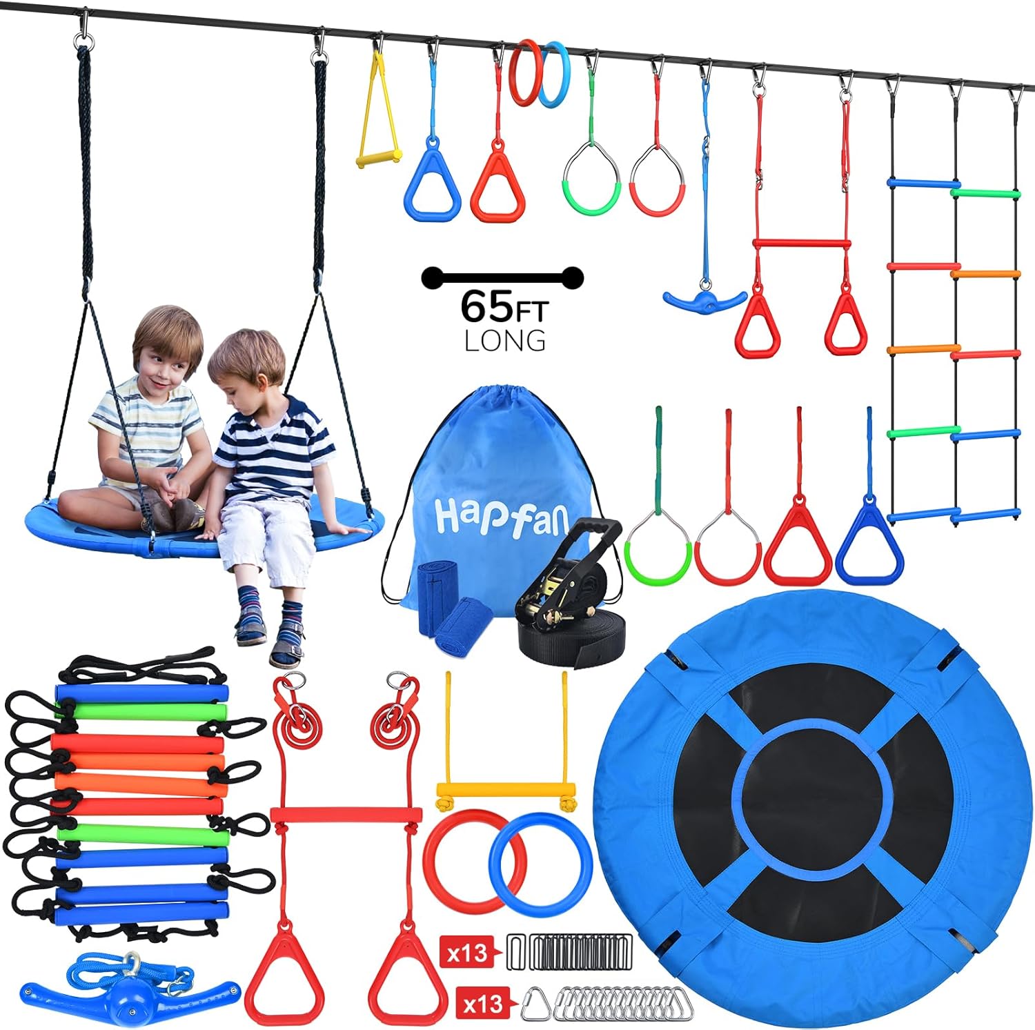 - 【Great Value Set】Hapfan ninja obstacle course consists of 65 ft slackline and 11 accessories. The most pupular accessories are included in this kit, like saucer swing, 360° rotation ninja twister swing, trapeze bar swing, unique climbing net ladder. They could be used alone on your tree branch, swing set or climbing dome