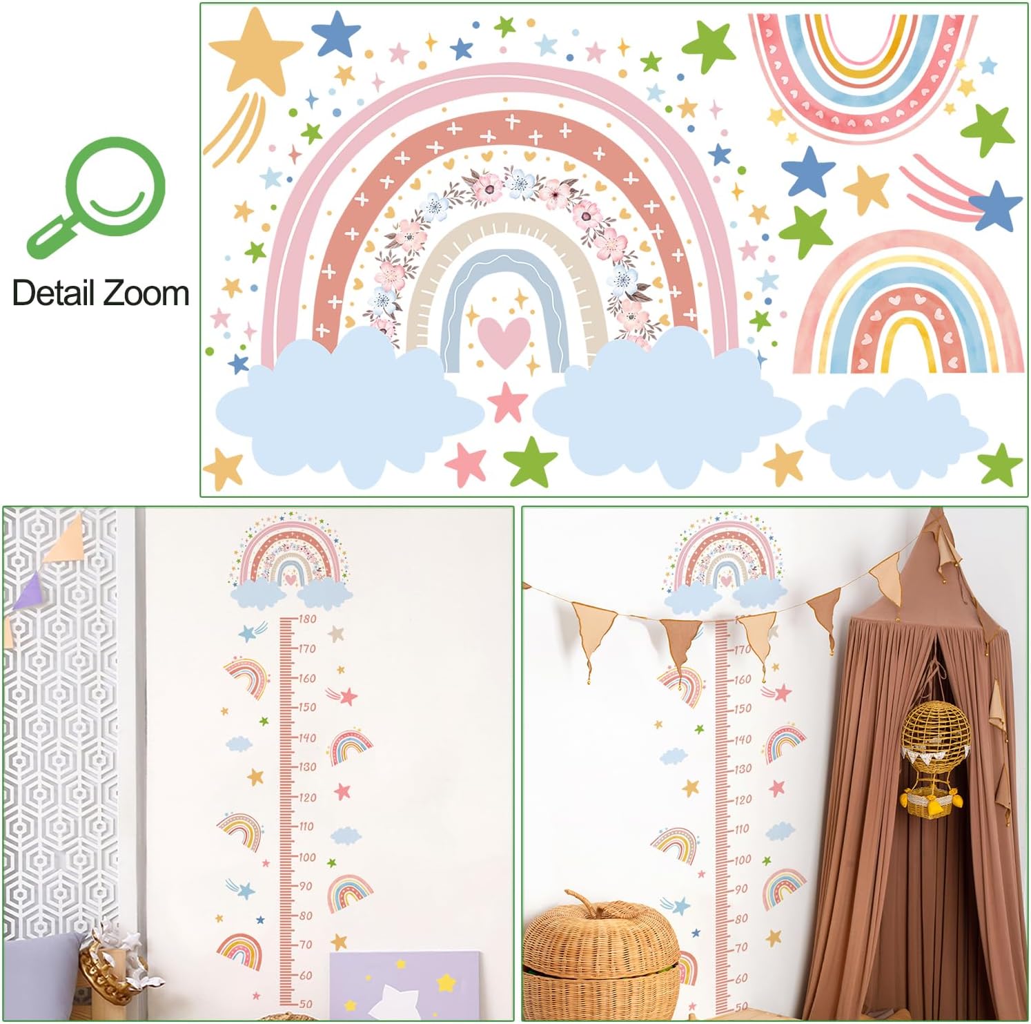- Ingenuity Design:This high height wall sticker has a unique design style, and the pink cartoon rainbow is very popular with children. Combined with a height scale, it is very creative and tailored for your child, paying attention to their healthy growth.