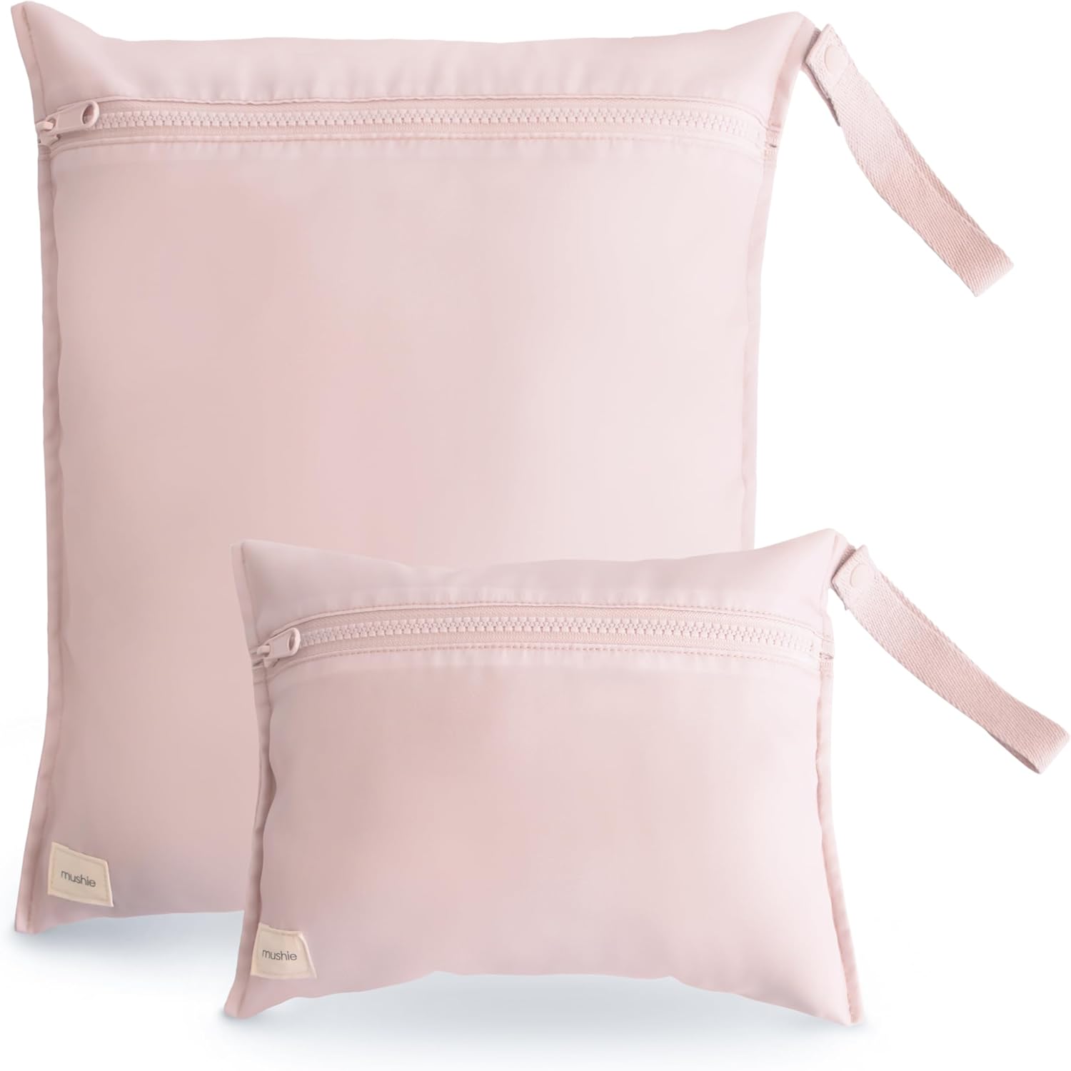 mushie Water Resistant Wet Bags | Large & Small Reusable Storage Bag for Baby Items and Travel | Zippered Pockets with Handle | Machine Washable, Set of 2 (Blush)