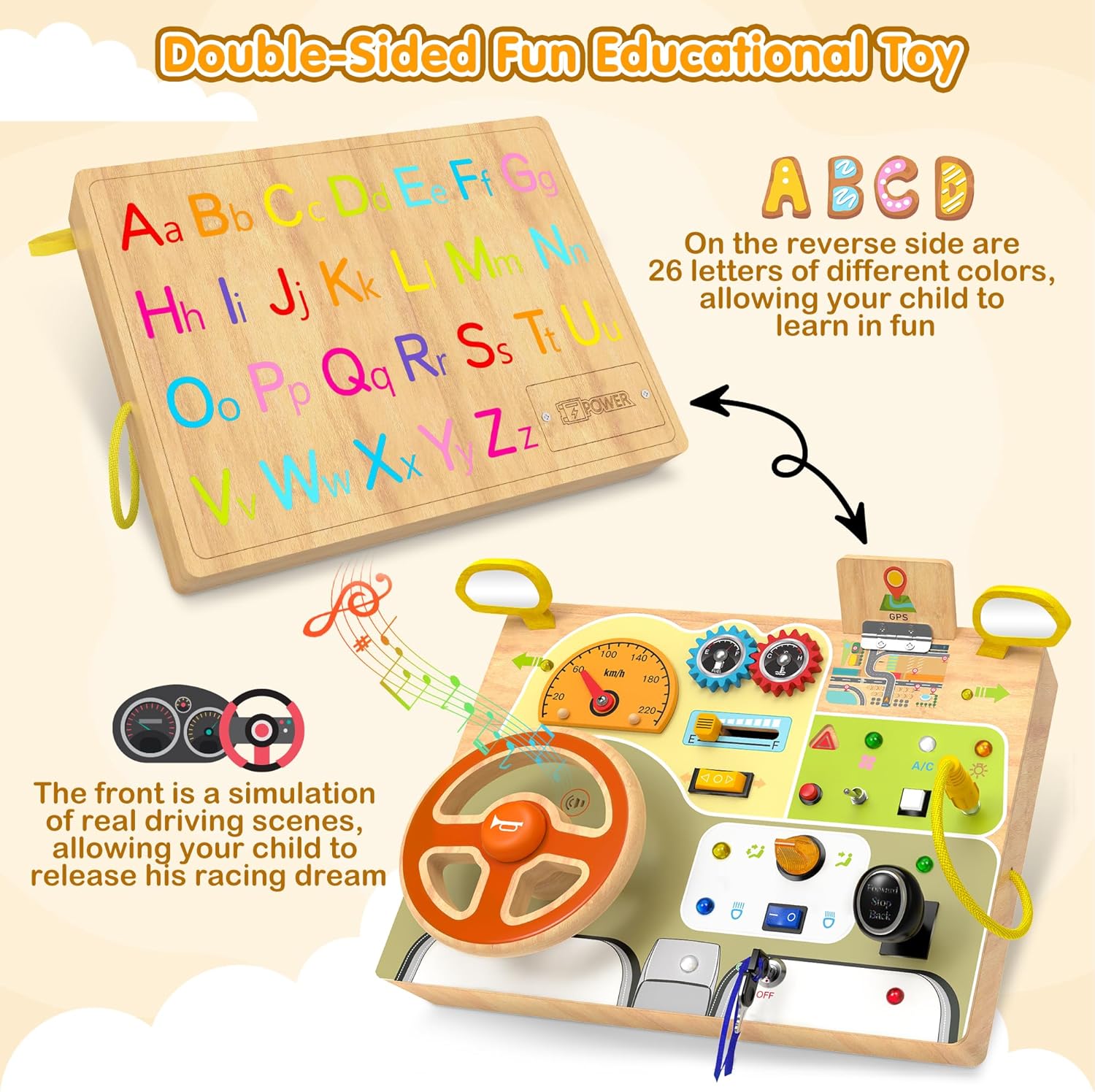 - Fun and Educational Toys:This busy board move the car to a small wooden board, simulating the scene of real driving, ignition switch, steering wheel, operating lever, all kinds of directional lights, warning lights, mirrors, dashboard... One by one presented in front of you, let your child to release his racing dream, no child does not like this! The reverse side of the busy board also has 26 letters in different colors, so that your child can learn in fun and stay away from the screen.