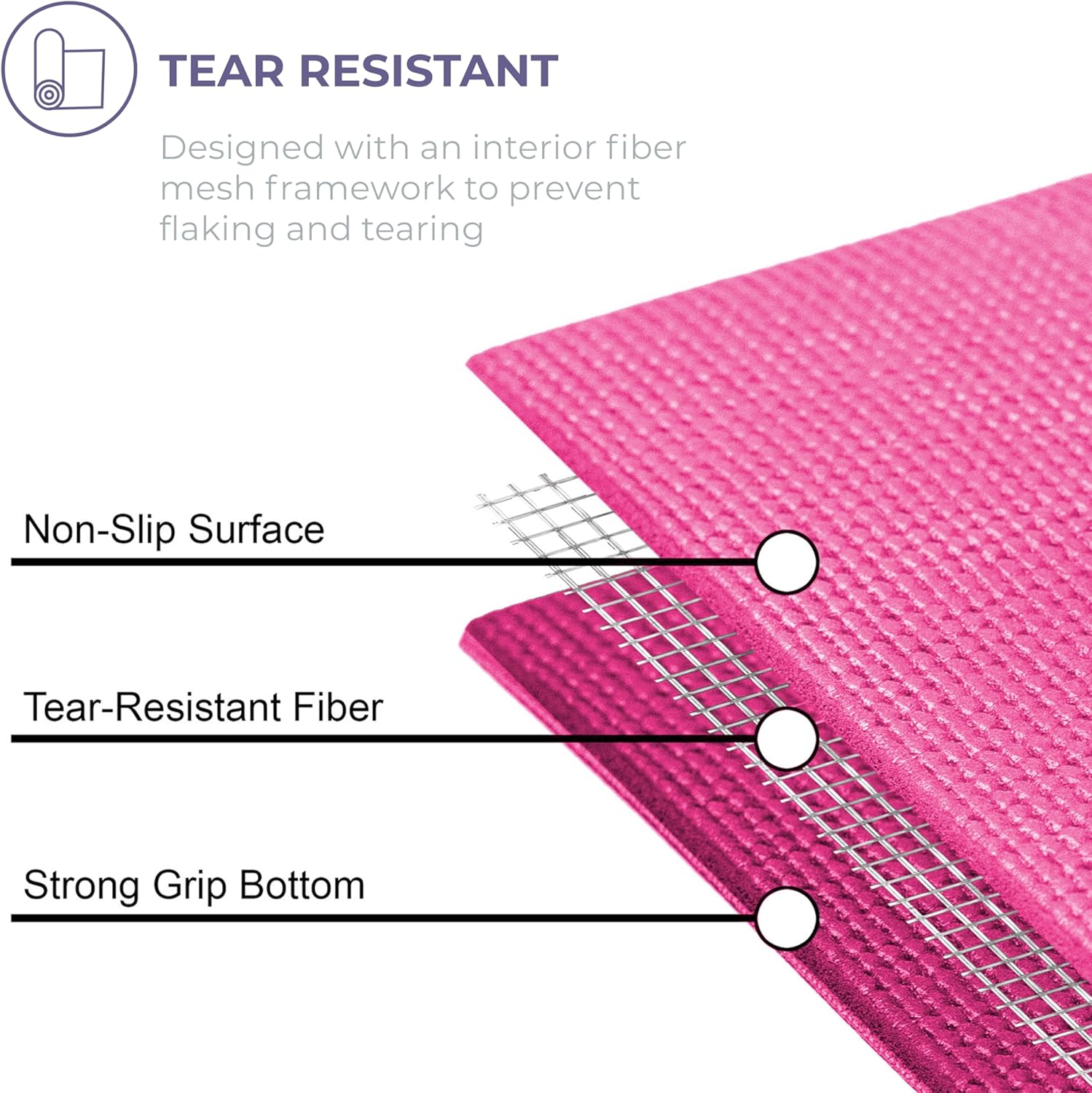 - Non-Slip: The fitness mat features a textured surface for stability and balance when changing or maintaining poses; created with an interior fiber mesh layer to reduce mat stretch and resist tears for longevity