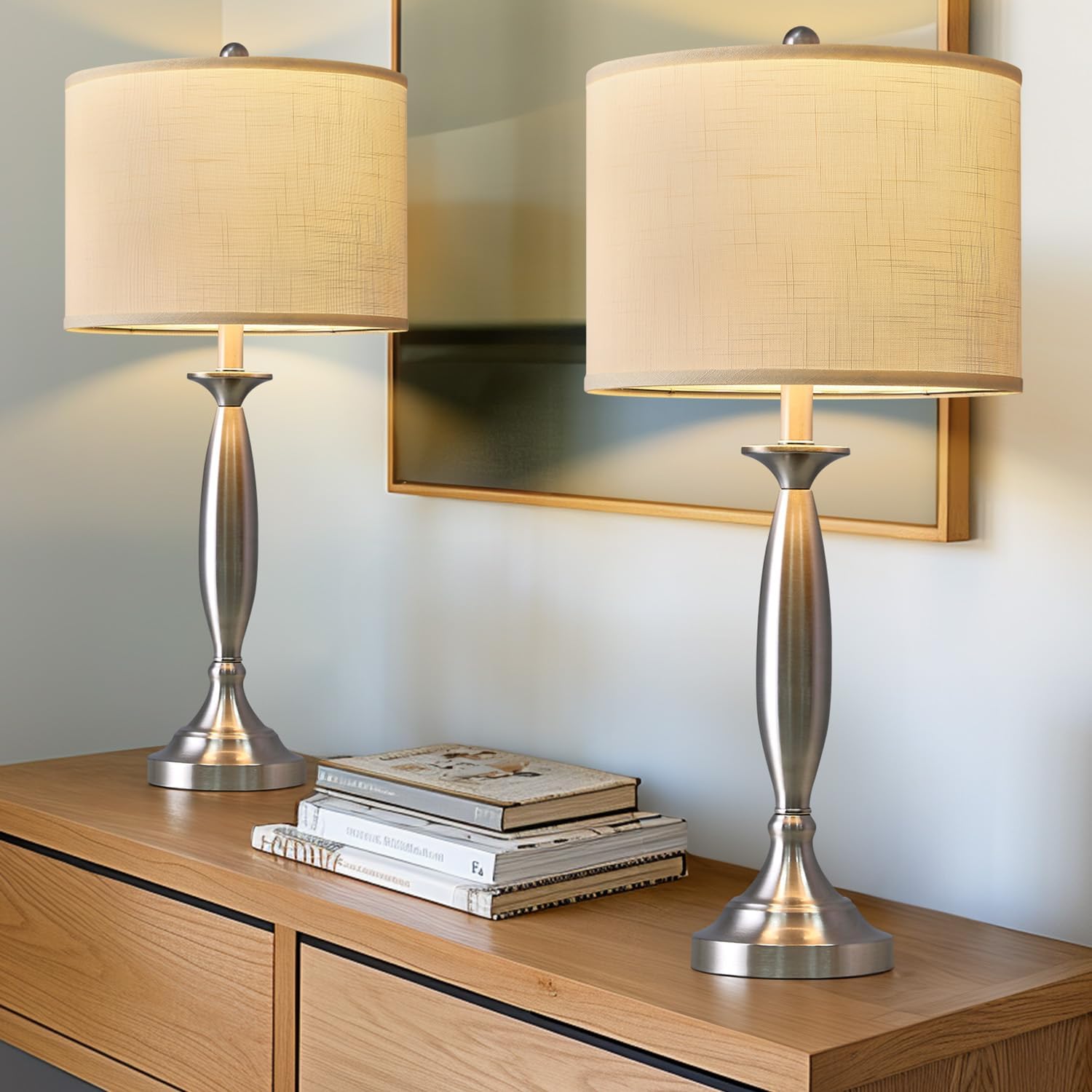 - Minimalist &Modern Design: The set of 2 bedside lamps are constructed of high-quality silver metal base and linen fabric lamp shades that provide a modern feeling aesthetic. Table lamp for living room is perfect in living room bedrooms, bedside, cafΓ©, corridors, restaurants, etc. It displays a warm and beautiful atmosphere to a room.(Note: The shade needs to be assembled)