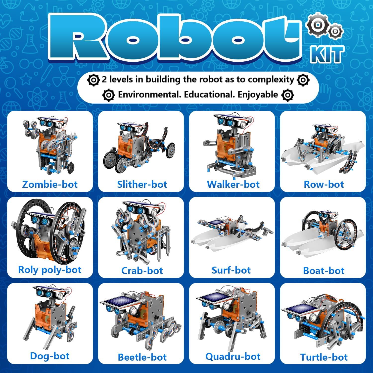 - 【13-in-1 STEM Solar Robot Kit】: The STEM robotics kit can build 13 different types of robots, which can move on land or water, enjoy different robot running experience! Exercise children’s problem solving and hands-on ability, dedicated to little engineers’ research on robot assembly, and create the great parent-child interaction and stem projects for kids ages 8-12.