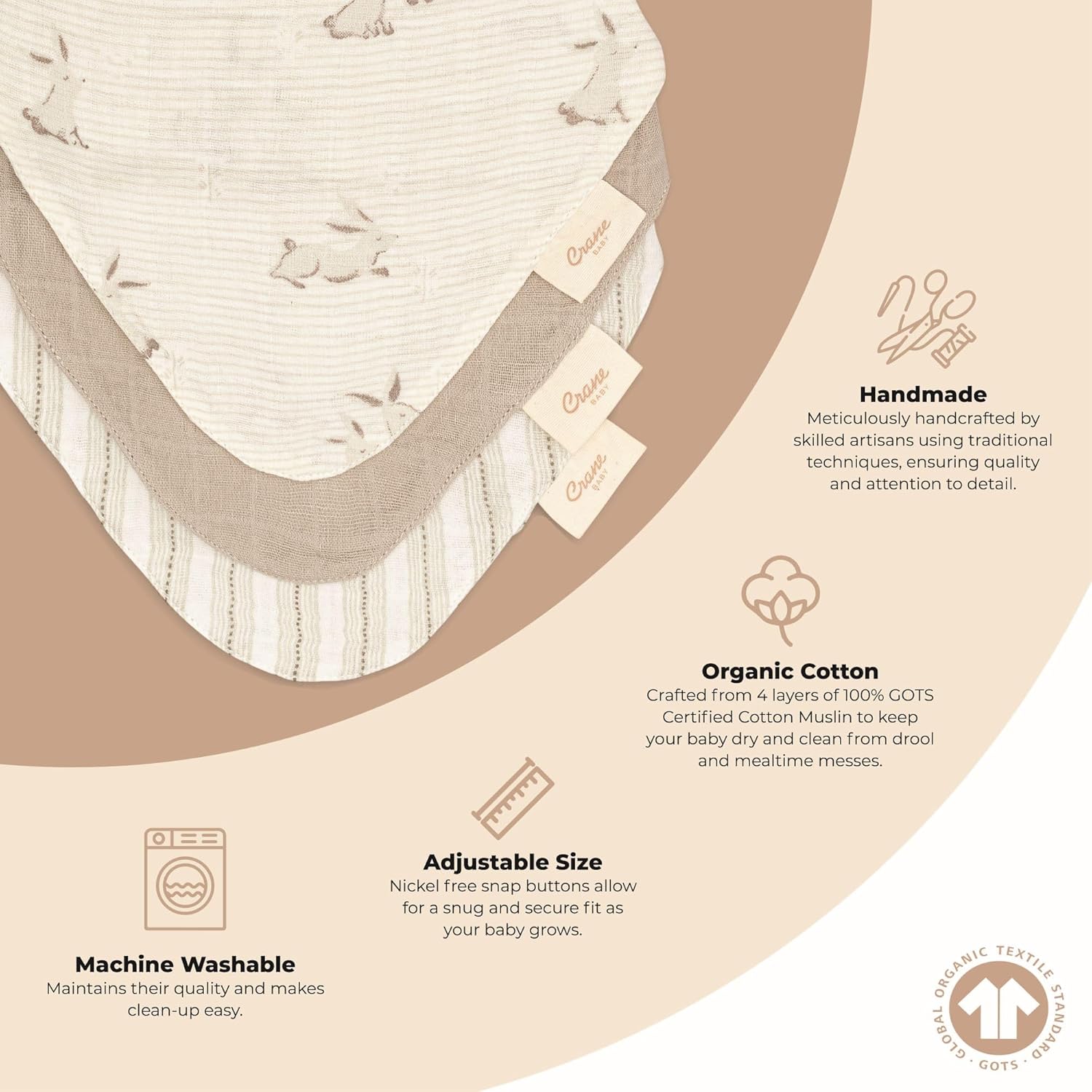 - Certified Organic Comfort: Our Avery Organic Bib Set includes three hand-crafted bibs made from the finest GOTS certified organic cotton, ensuring a soft and gentle touch against your baby's skin during mealtime