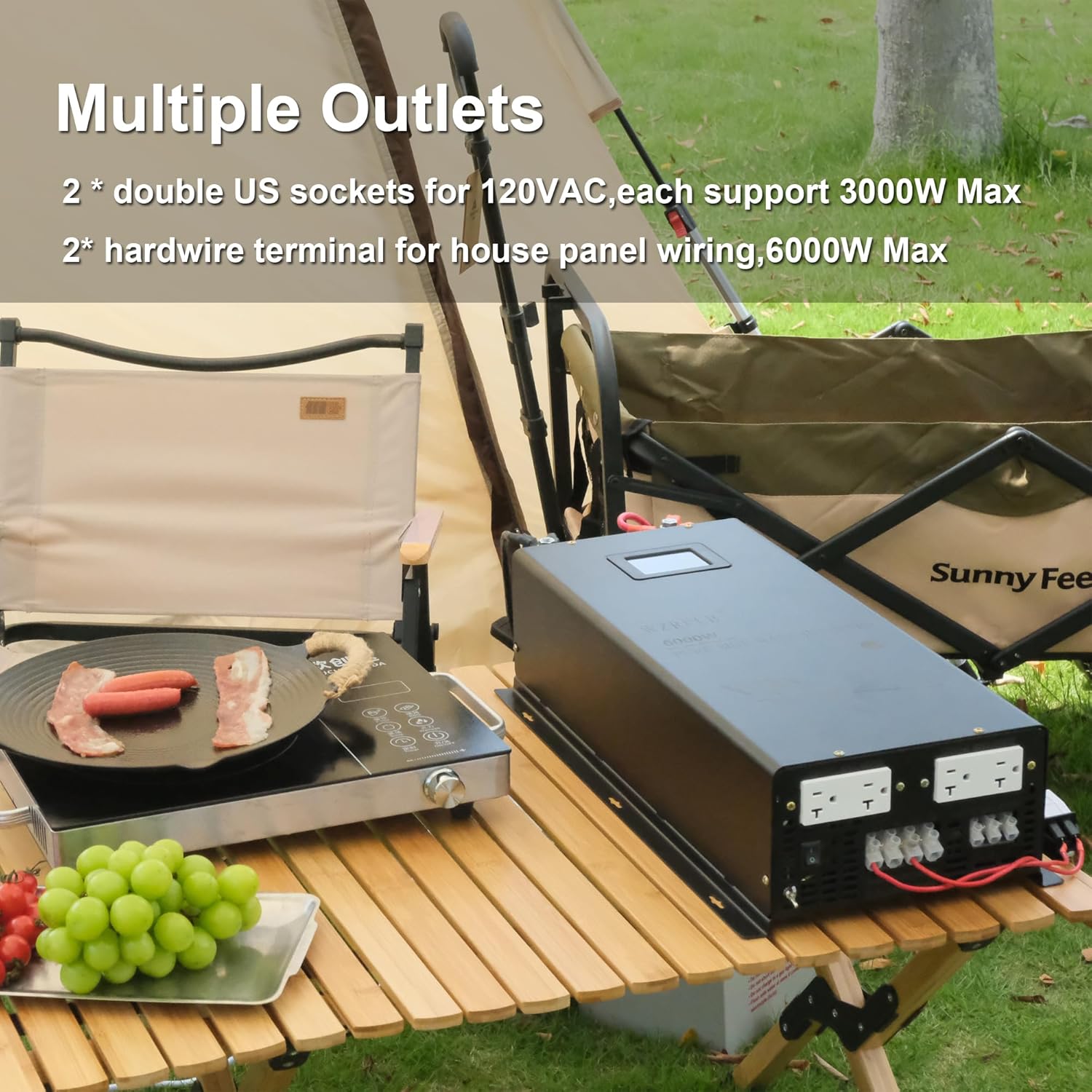 - FEATURES: 2pcs dual 120V outlets with max 3000W each, 1*240VAC hardwire terminal(3-wire) with 6000W max (L+N=240V) and a hardwire terminal(4-wire) with Multi-mode (L1+L2=240V, L1+N=120V, L2+N=120V ),support 120VAC and 240VAC output at the same time,up to 91.6% efficiency