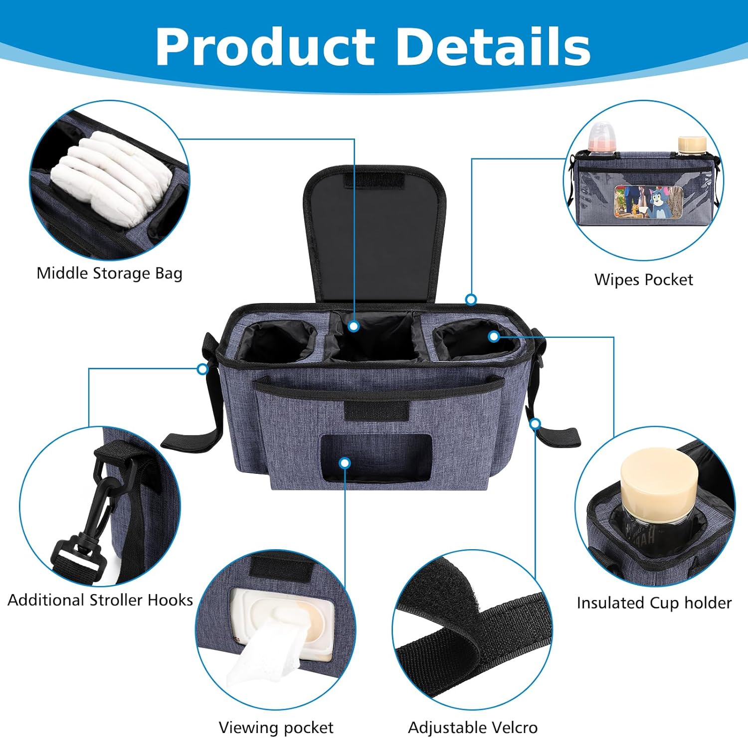 - Structured Stroller Organizer: This stroller caddy features an internal partition system that provides multifunctional compartments for efficient organization. The middle large storage compartment can storage baby diapers, toys, clothes, pacifiers or other accessories; 2 insulated cup holders on two sides, can be used to place baby bottles, beverage cups, water bottles etc. A convenient open pocket on the front for easy access to wet wipes or tissue.