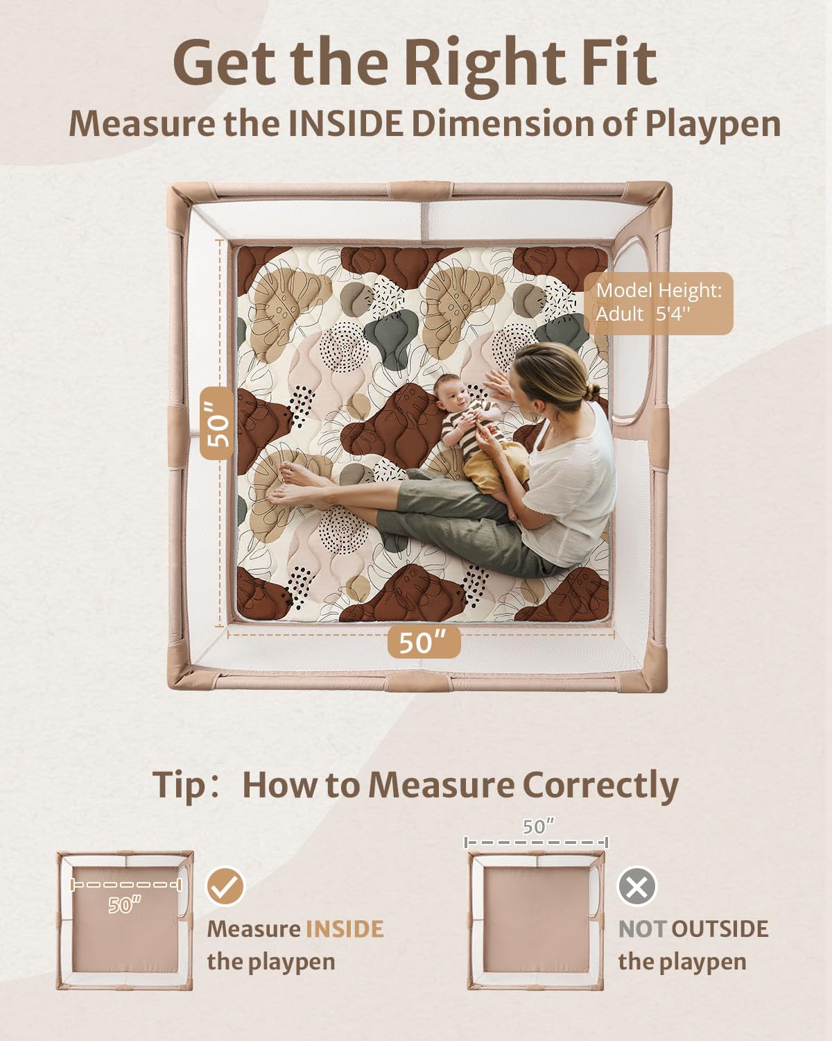 - Perfect Fit & Versatile Use β Measuring 50Γ50 inches, this mat fits playpens with the same INSIDE dimensions. Also great for tents or indoor/outdoor play. Please measure your space or playpen for a proper fit. More sizes available for your need
