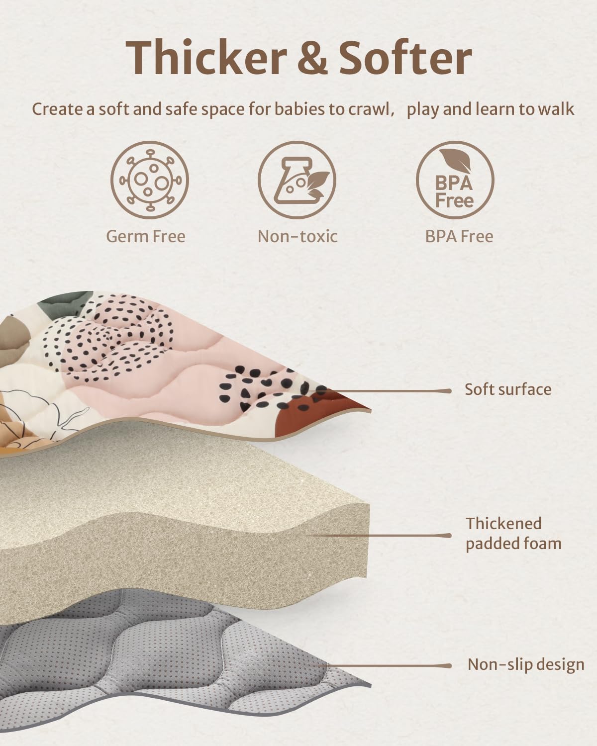 - Thicker & Soft Premium Foam - Our baby play mats for floor is thicker than most other brand baby play mat. And it's made of premium soft padding foam and fabric top layer to ensure a soft and cushioned surface, providing a comfortable place for your little one to relax, play and work on their developing skills