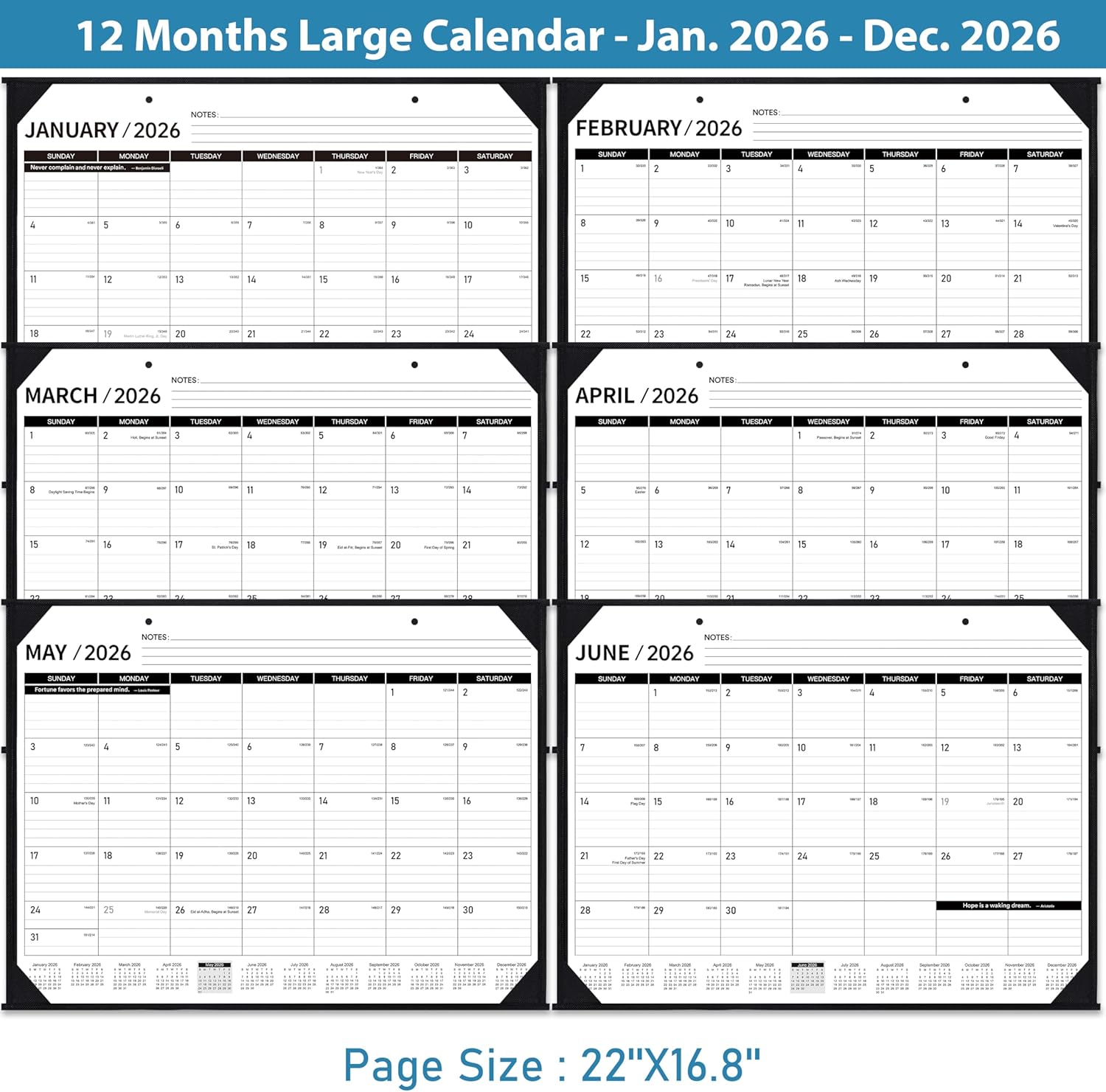 - Monthly Overview - Each monthly page of the large 2026 calendar has a large daily section with horizontal lines for neat scheduling. Notes section is set at the top to make the important items you specially recorded visible, and the 18 month mini overview calendar at the bottom is helpful for long-term planning. In addition, the marked holidays will remind you of every important date.