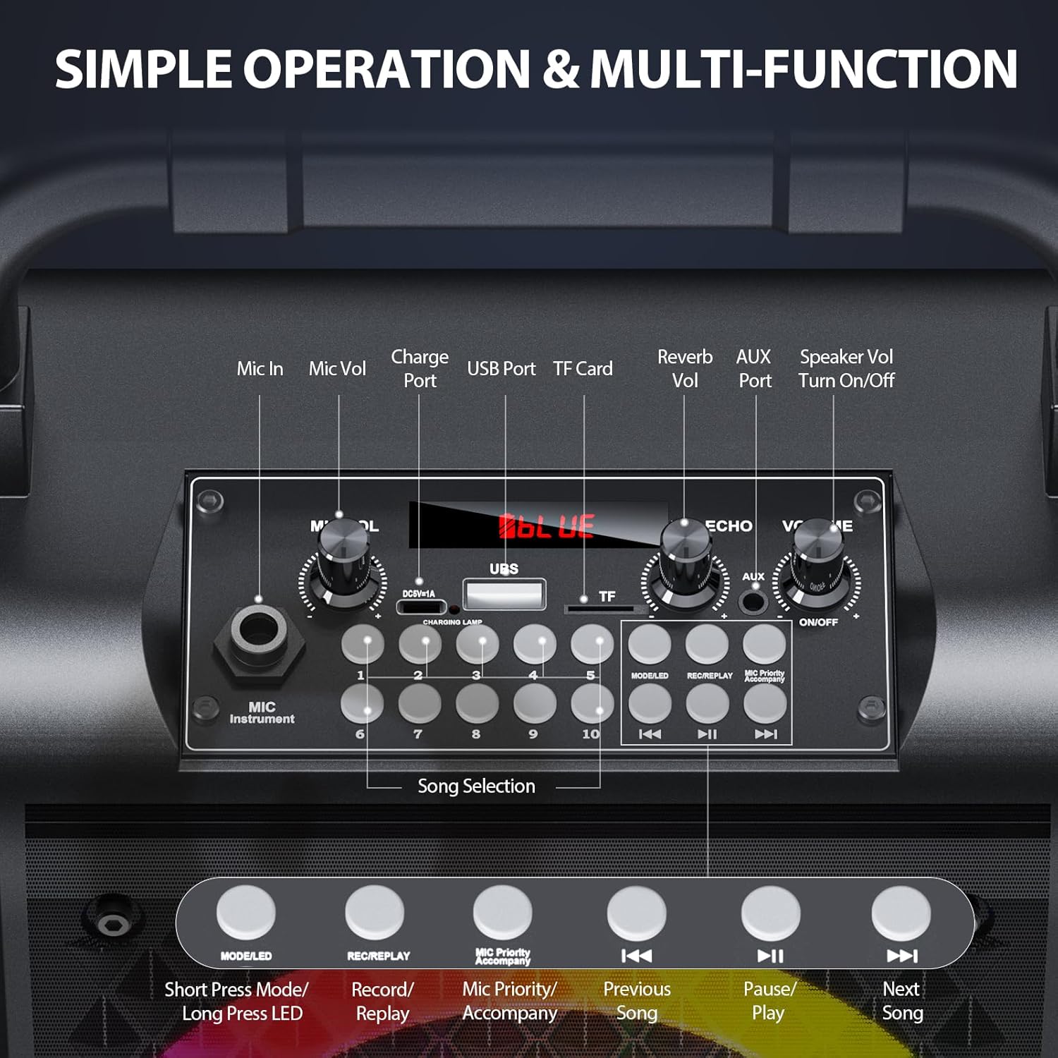 - ๐๐๐ฎ๐ฆ๐ข๐ง๐จ๐ฎ๐ฌ ๐๐๐ฅ๐จ๐๐ข๐ ๐๐ฉ๐๐๐ญ๐๐๐ฅ๐: The portable pa system designed with 6 lighting modes,you can change the vibrant, rhythm-synced lights by long press "M" button. The dynamic light display creates an immersive atmosphere, making every song a memorable karaoke party with karaoke speaker.