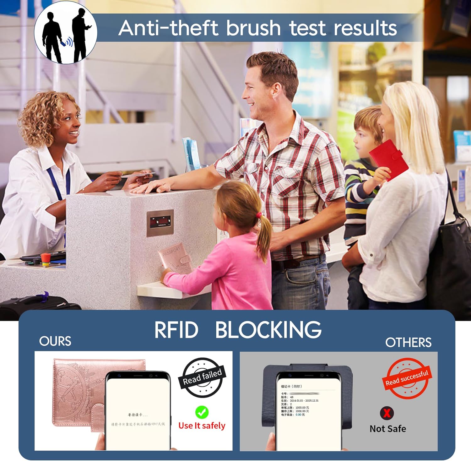 - ★【RFID blocking -travel wallet】RFID Passport holder case is made of Faux Leather and RFID-blocking shield materials, RFID Blocking security feature ensures that your personal information remains safe from potential theft while you travel.Passport holder for family can put necessary things, makes travel and business trips a breeze.If we get compliment for trip,of course we need to spread the song all over USA.