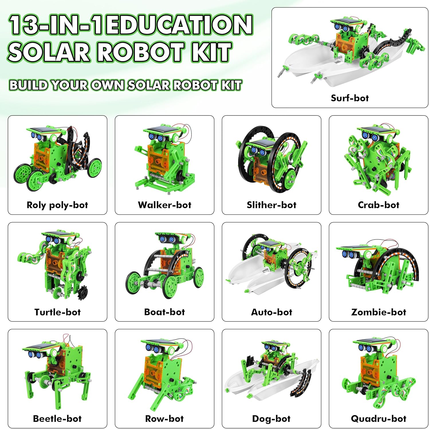 - 13-in-1 Solar Robot Kit: Kids can follow the step-by-step user's manual to build 13 different types of robots by splitting and reassembling, which can move on land or water. Includes the robot's moving and connecting parts like gears, plates, tires, and shafts. Parts can be easily disassembled after completion of every robot build.Cool Science Kit for Boys and Girls Aged 8-12|Birthday Gifts Ideas for Kids|STEM Learning & Education Toys for 8,9,10,11,12 Year Olds