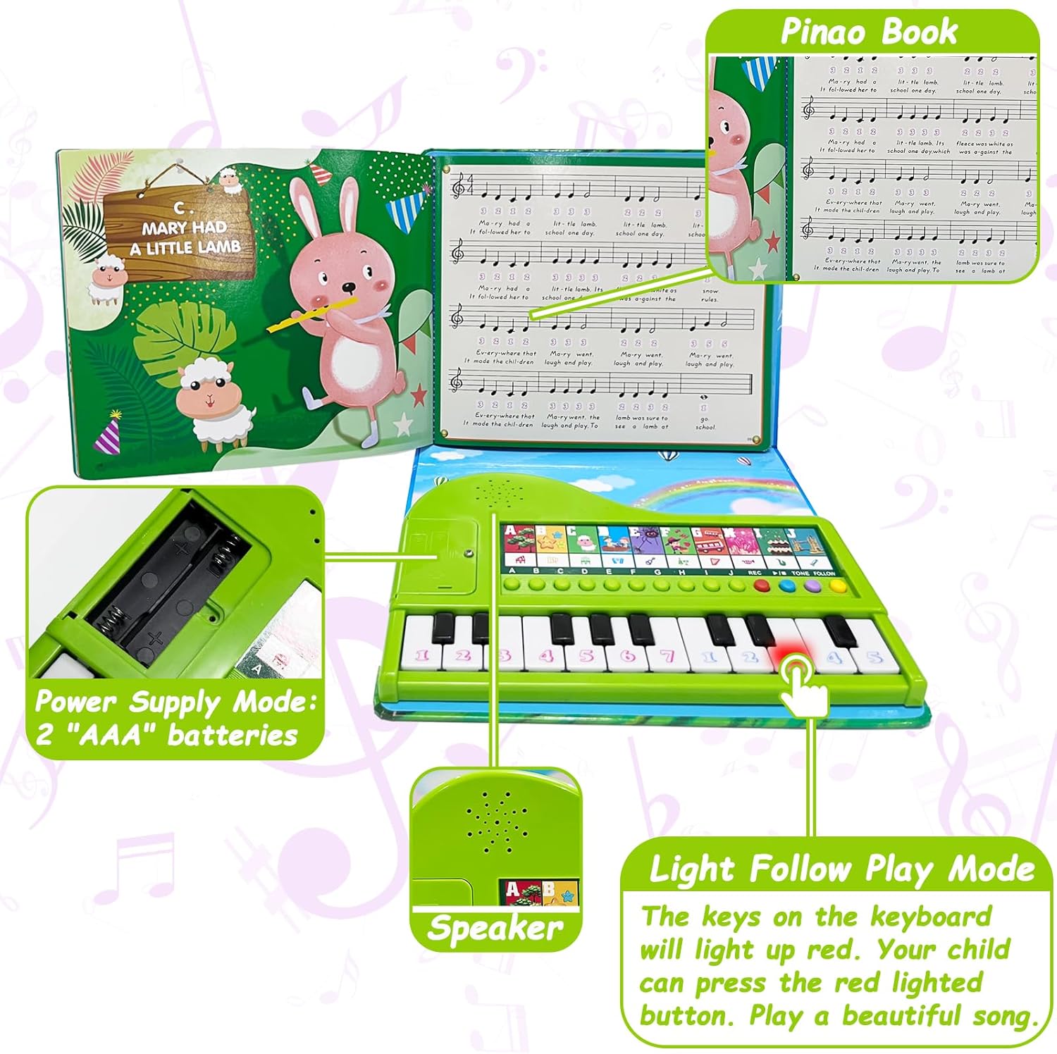 • ♬ MULTIFUNCTIONAL 20 KEYS PIANO — Play piano function + recording and playback function + key lighting follow function + Piano book + 10 tones + 10 demos.