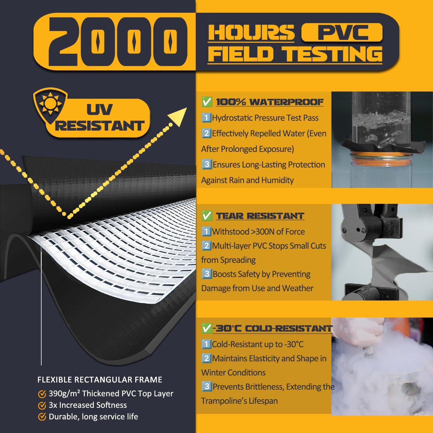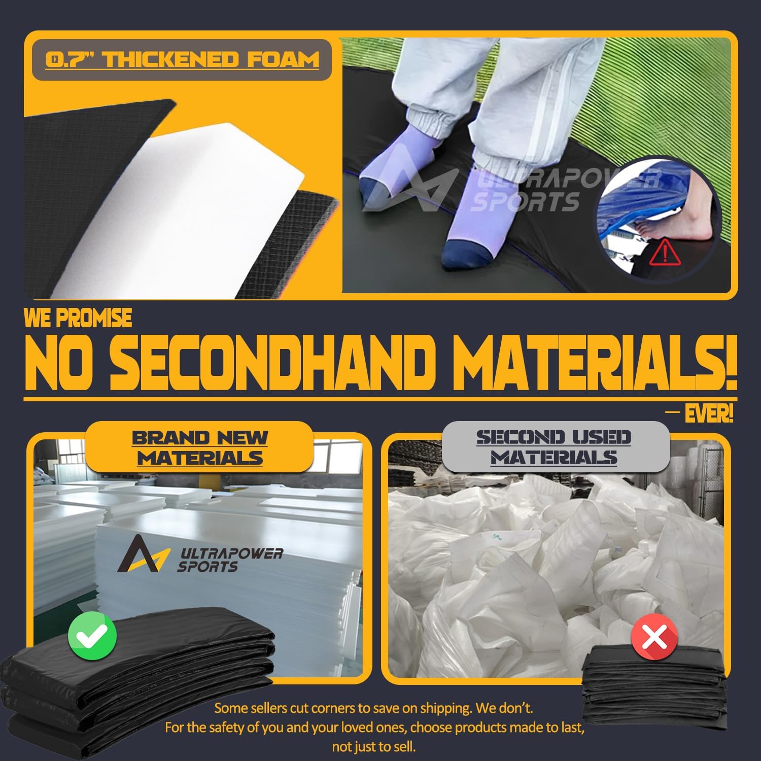 - 🏆️【Trusted Quality ULTRAPOWER SPORTS trampoline pad】 As a top-tier trampoline replacement mat brand, we prioritize safety and durability. We believe that you who appreciate quality will know how to choose wisely. The double industrial-grade stitching and triple-layer construction (PVC + PE + padding) outperform other flimsy covers. Whether replacing worn-out mats or upgrading old trampolines, choose our trampoline pad replacement that balances affordability with professional-grade performance.