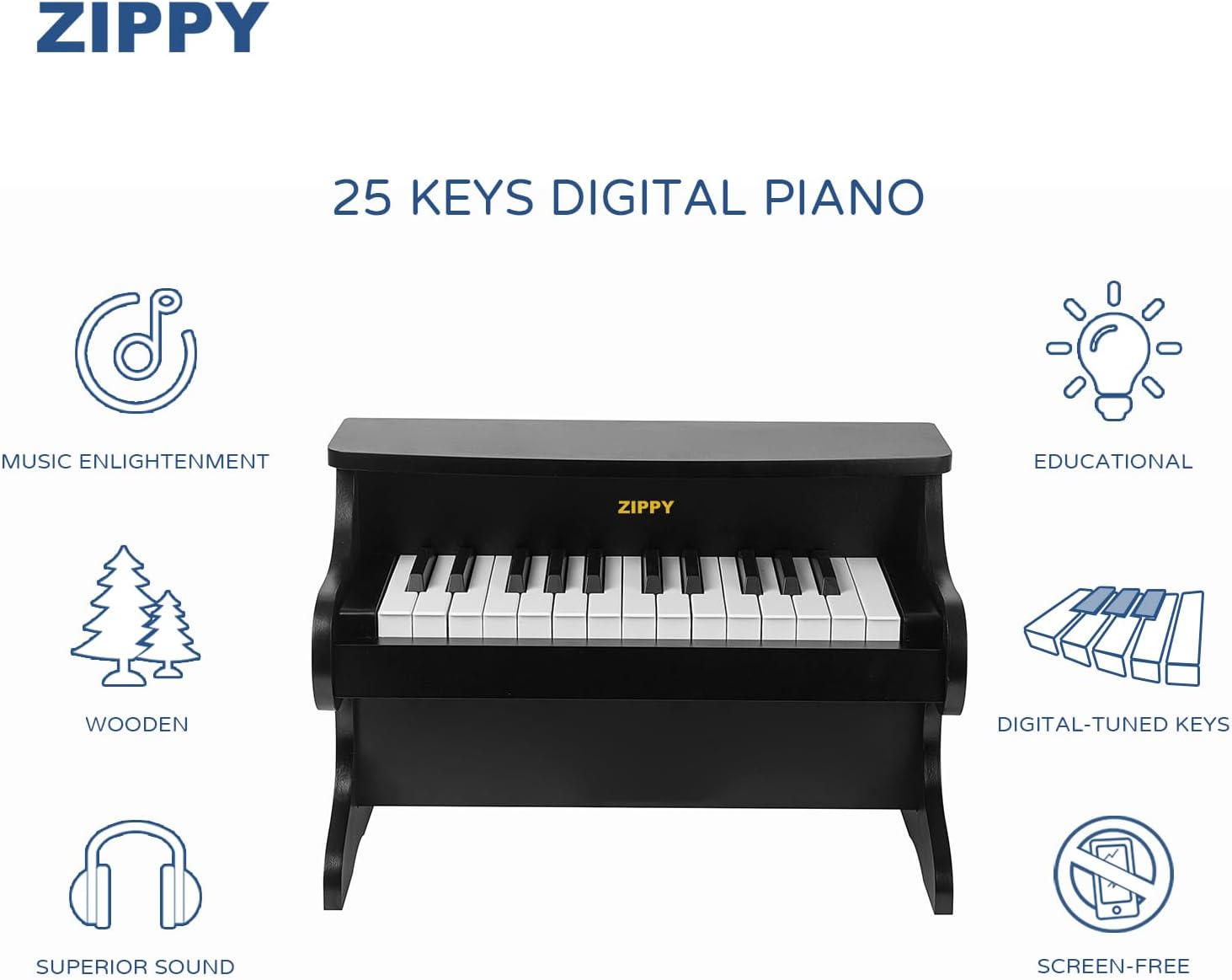 ZIPPY Kids Piano Keyboard, 25 Keys Digital Piano for Kids, Mini Music Educational Instrument Toy, Wood Toy for Toddlers Girls Boys (Black)