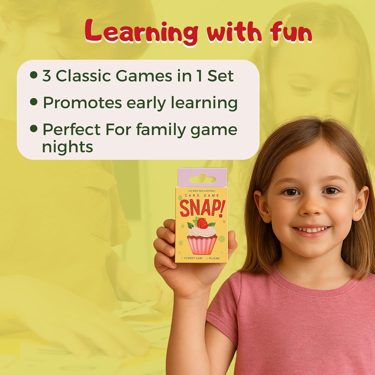 - 3-in-1 Card Game Set for Endless Fun – Enjoy three exciting games in one: Snap, Pig, and Memory Match! Designed for 2-6 players, these engaging games are perfect for kids aged 4 and up. Ideal for family game nights, birthday parties, and travel entertainment, this set helps develop cognitive skills, memory, and creativity while ensuring hours of laughter and fun.