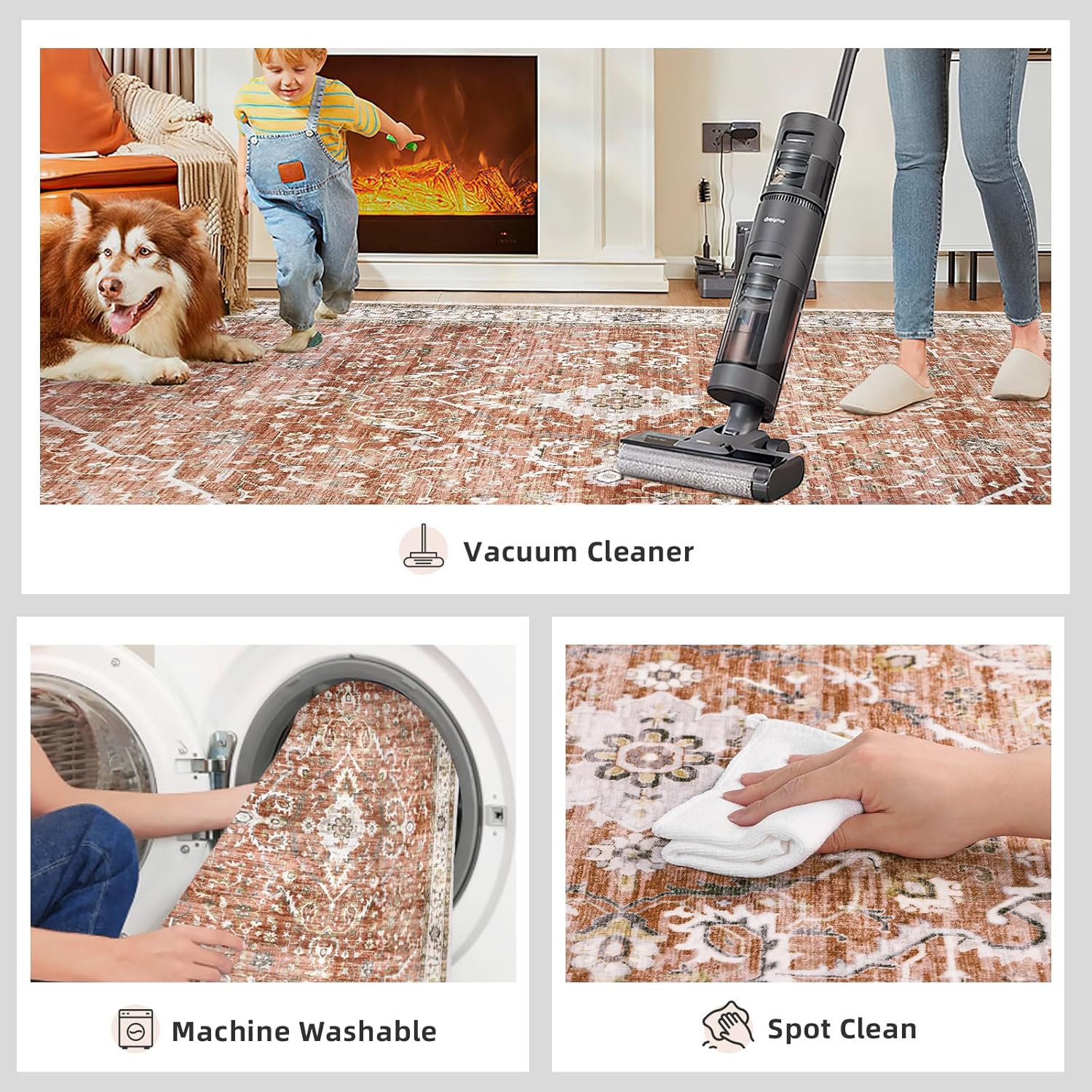 Deerly Rug Runner - Boho 3x8 Washable Kitchen Rug Runner with Non-Slip Backing, Non-Shedding Floral Soft Runners for Hallways Distressed Carpet Runner Rugs for Bedroom Brick Red