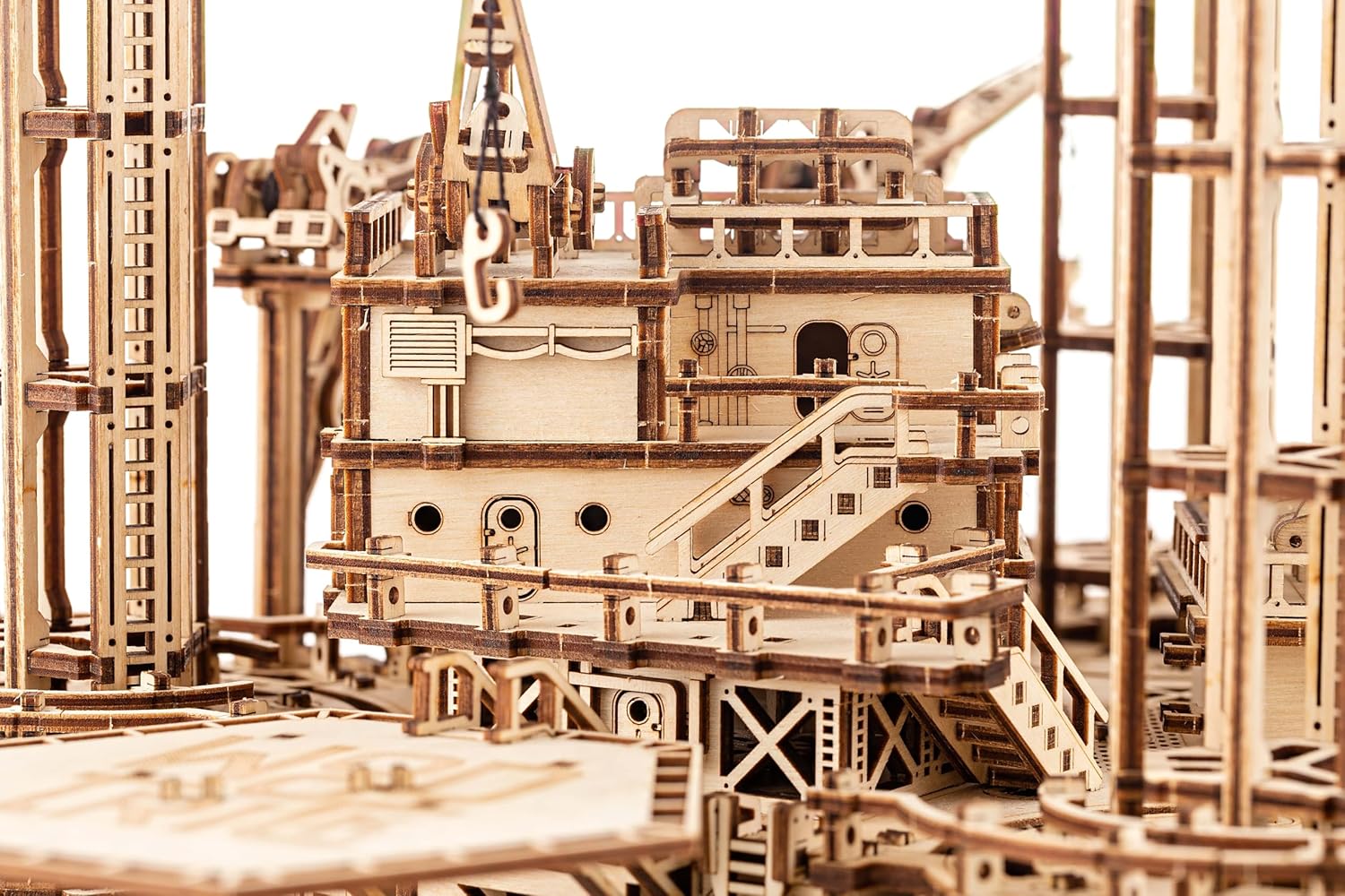 - NATURAL WOOD - Offshore Rig Platform is a detailed model building kit made entirely of wood. Put together 1180 pieces and get a captivating wooden model of a real oil drilling rig! Comes with an illustrated step-by-step assembly guide and requires no glue to be fully assembled. Dimensions: 14x12x14 inches.