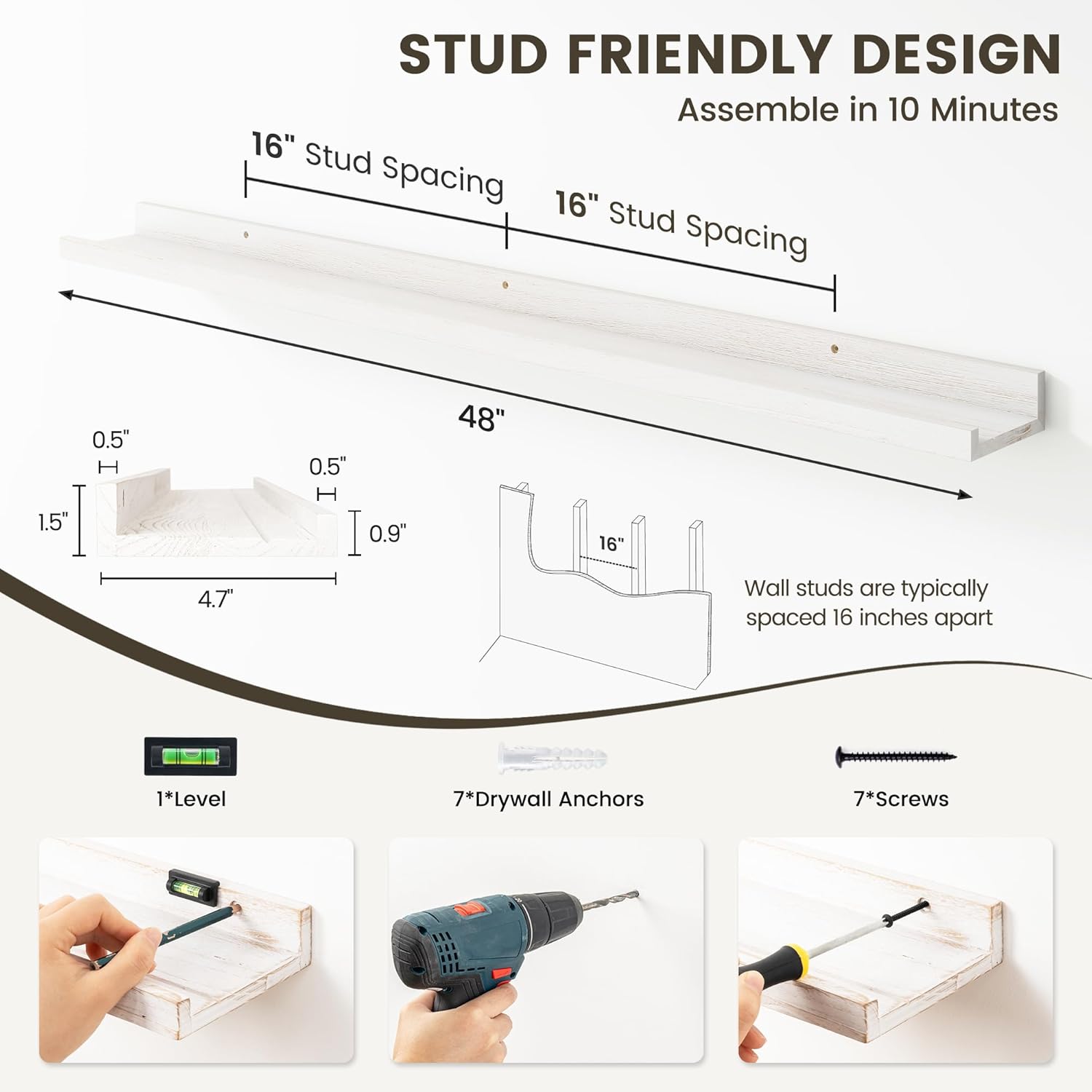 - ăSeamless InstallationăOur Picture Ledge Shelves set is designed for easy and simple installation. The package includes all the necessary hardware to get your wood floating shelves up on the wall in no time. Follow the instructions provided, and your wall shelf will be ready to use within minutes.