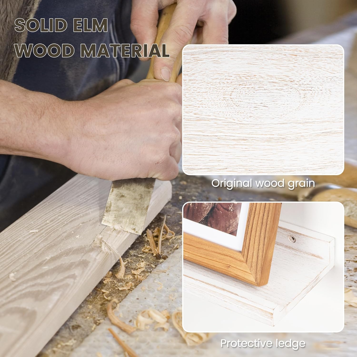 - ă100% Solid Elm Wood ShelvesăEmploying reclaimed elm wood renowned for its glamorous texture, we meticulously select pieces showcasing beautiful wood knots and distinctive grain patterns, enriching the character of your living space. Our hand-crafted wood shelf feature a rustic natural finish, ensuring durability for lasting appeal. Each shelf is distinct in grain, color, finish, and texture, adding a touch of uniqueness to your decor.