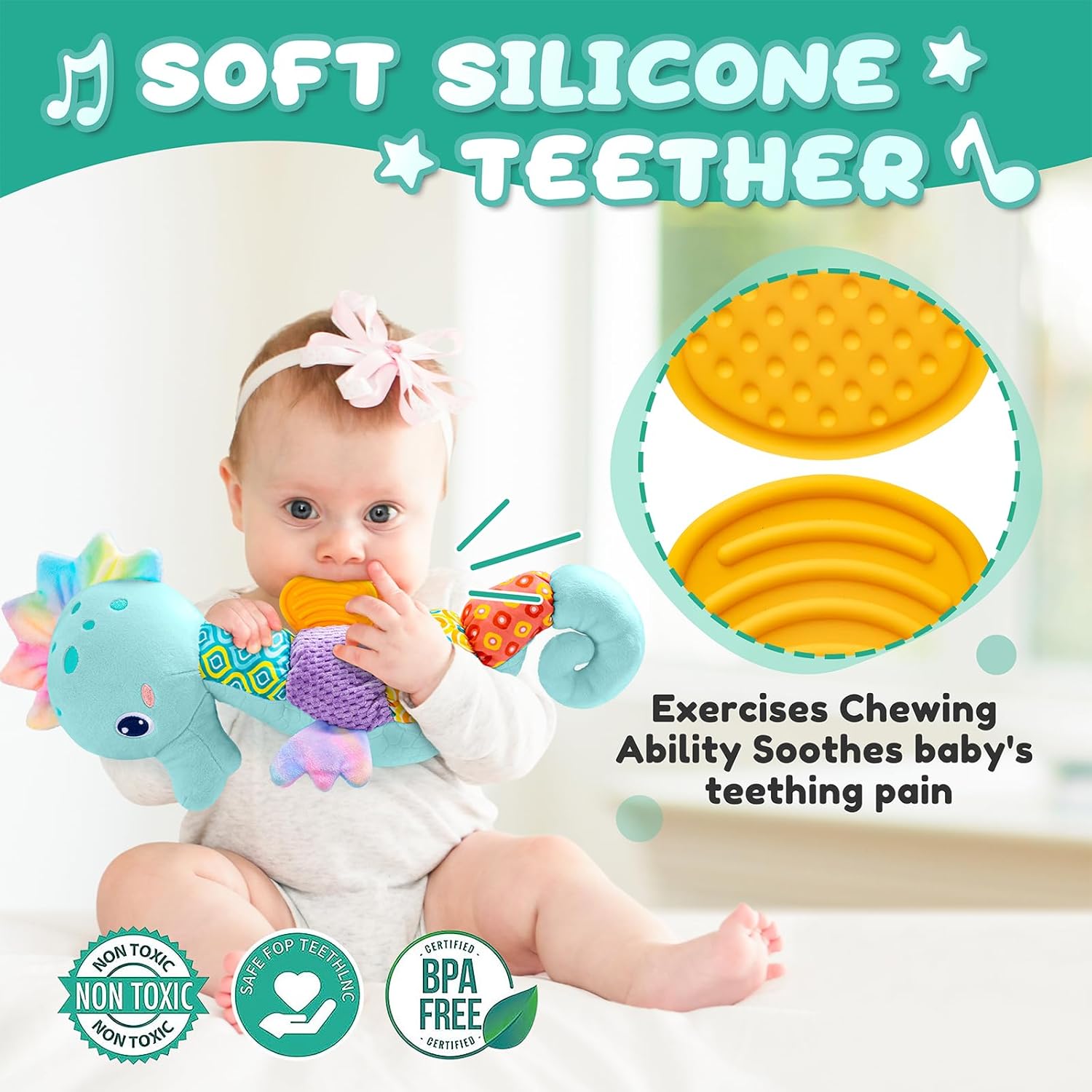 - 👶AUDITORY DEVELOPMENT - The adorable musical Seahorse produces delightful sounds, including a crinkle rattle and a music box. These stimulating features contribute to auditory development, providing endless fun for your baby girl.
