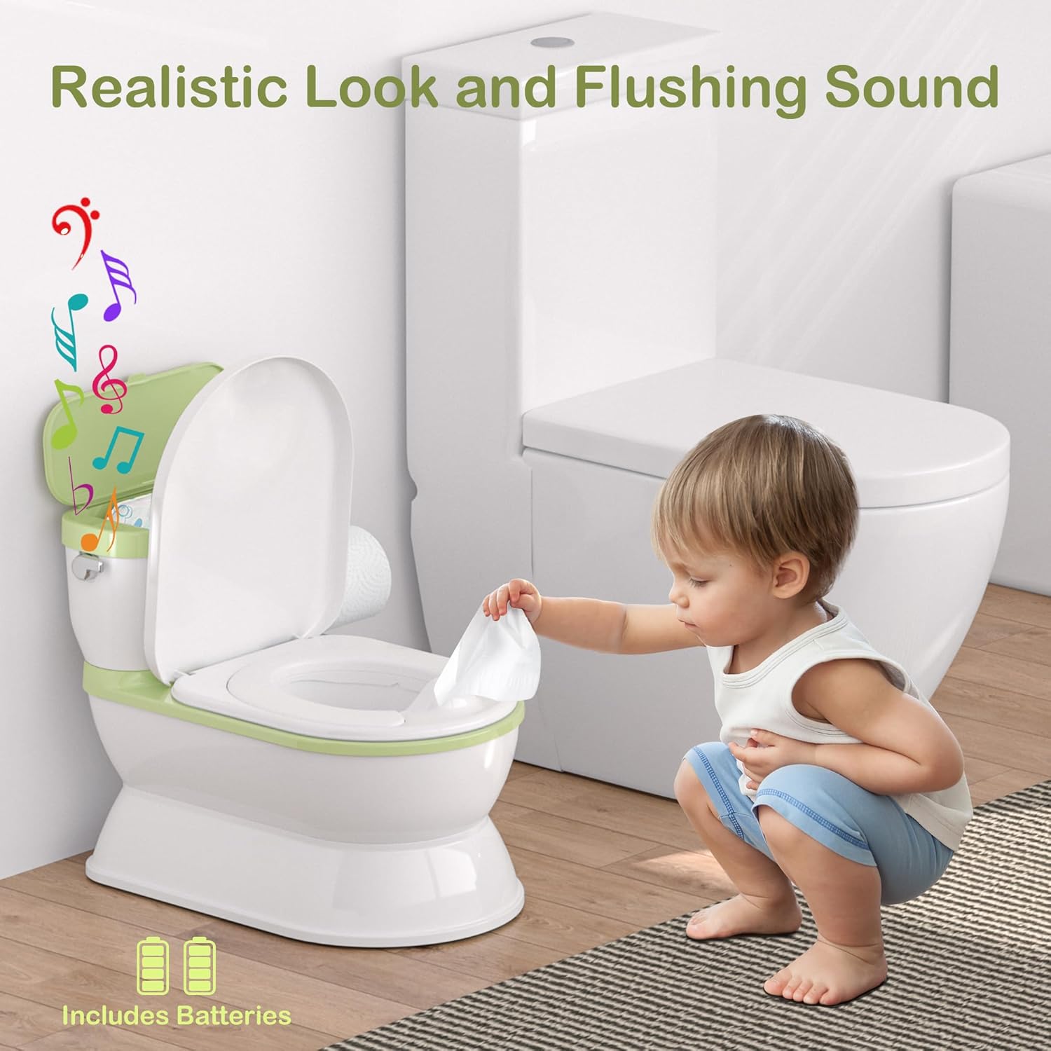 2-in-1 Toddler Potty Training Toilet - Larger Potty Chair & Detachable Training Seat for Boys & Girls Ages 1-3 with Flushing Sound, Wipes Storage, Toilet Paper Holder - Green