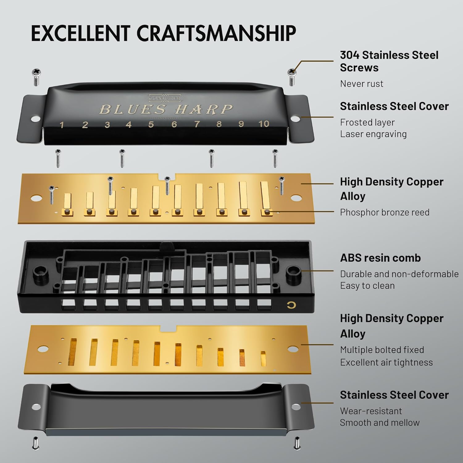 - [Quality and Inexpensive]The phosphor bronze reed and brass plate used in the harmonica are sensitive to airflow and sound transmission. Every harmonica key is precisely adjusted to produce the desired tone. Professional harmonica standards are followed in the construction of this harmonica. It may be used by beginners to practice techniques like overdrawing and overblowing.