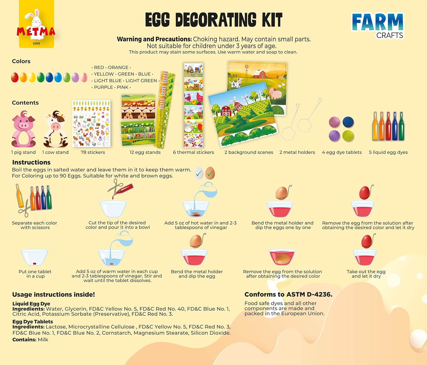 METMA 1999 Egg Decorating Kit Farm Crafts - Complete Decorative Eggs Set with Liquid Dyes, Tablets, Stickers, Egg Spinner and More - Fun Easter Egg Dye Kit Arts and Crafts for Kids (Farm Crafts)