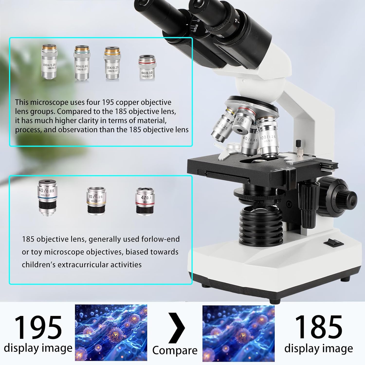 - The four 195 objective lenses installed on the objective converter have 6 magnifications: 40X, 100X, 400X, 1000X, 2000X, 5000X