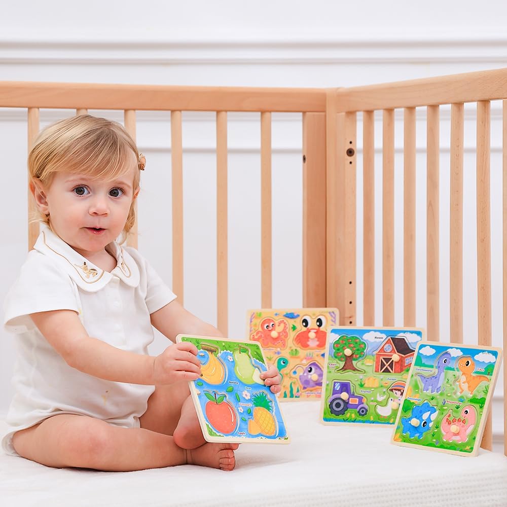 - 4 PCS TODDLER PUZZLES SET: Package comes with 1 box and 4 different patterns cute puzzles, sea animals, fruits, farm, and dinosaur.