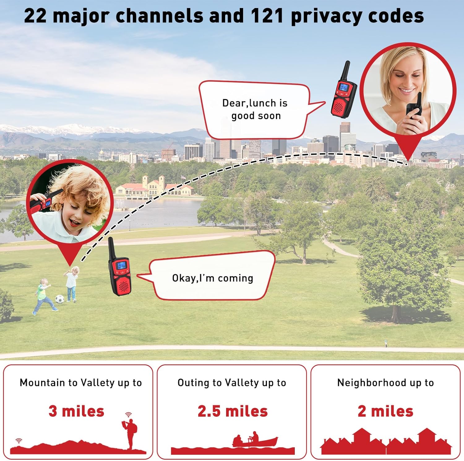 - ăKeep Children in Touch Even Without a Moblie Phoneă: 2 way radios suitable for indoor and outdoor communication long range, with maximum range and clear sound up to 3 miles, good communication helper for upstairs, downstairs, yard, tour, mall, outdoor activities.no more screaming for the kids to eat.