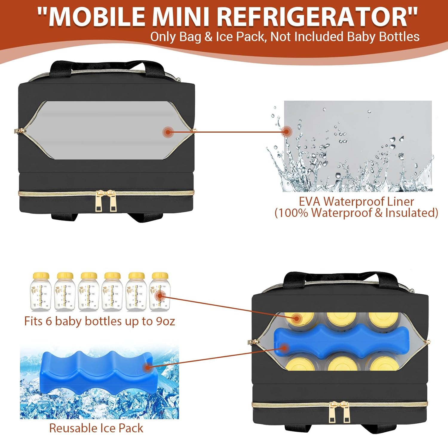 - PORTABLE COOLER COMPARTMENT - The cooler room with full waterproof& leakproof EAV lining, just like a ”mobile mini -fridge” keeps breast milk fresh for hours. It's a waterproof liner to prevent leakage and fits 6 baby bottles up to 9 ounces or some infant's milk storage bags.