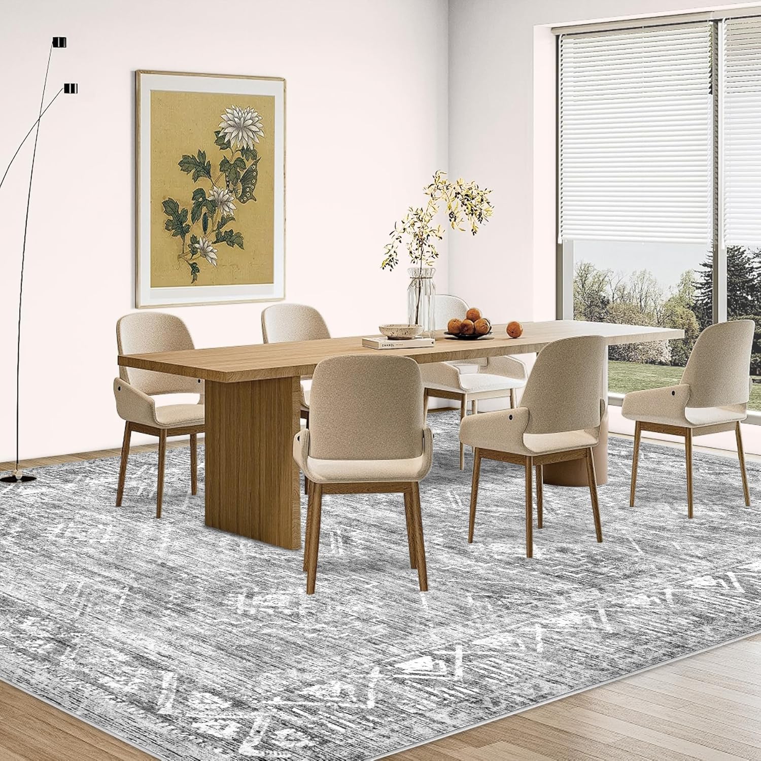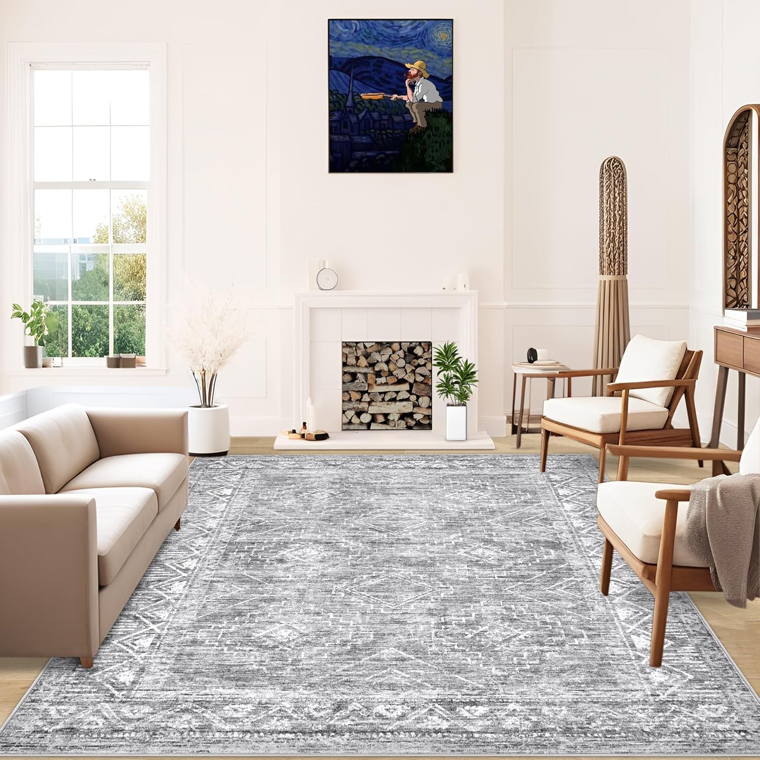 Large Living Room Area Rug 8x10 - Machine Washable Vintage Boho Moroccan Rugs Geometric Neutral Rug Non-Shedding Low Pile Distressed Farmhouse Carpet for Bedroom Nursery Classroom Dorm (8 x 10, Grey)