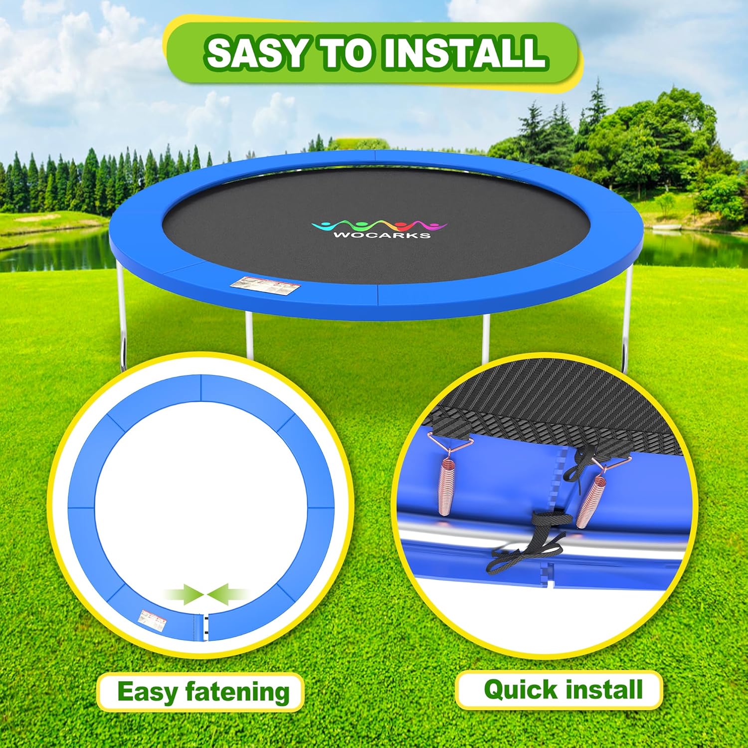 - [Essy to Assembly] 10ft 12ft 14ft trampoline pads feature an easy-to-attach bungee loop design. This design not only simplifies setup, but also ensures easy installation and replacement, prevent the pad from slipping or overturning. If you have any product quality problem, please feel free to reach out to us during your free time. We reply issue during 24 hours and provide satisfied solution in time