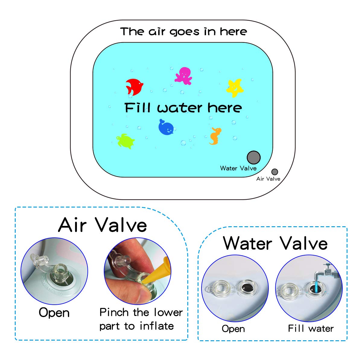 - 【Baby Water Mat and Safe】: The baby water play mat is made of BPA-free PVC materials that has been thoroughly tested, proved tummy water mat is comfortable soft, inflatable.