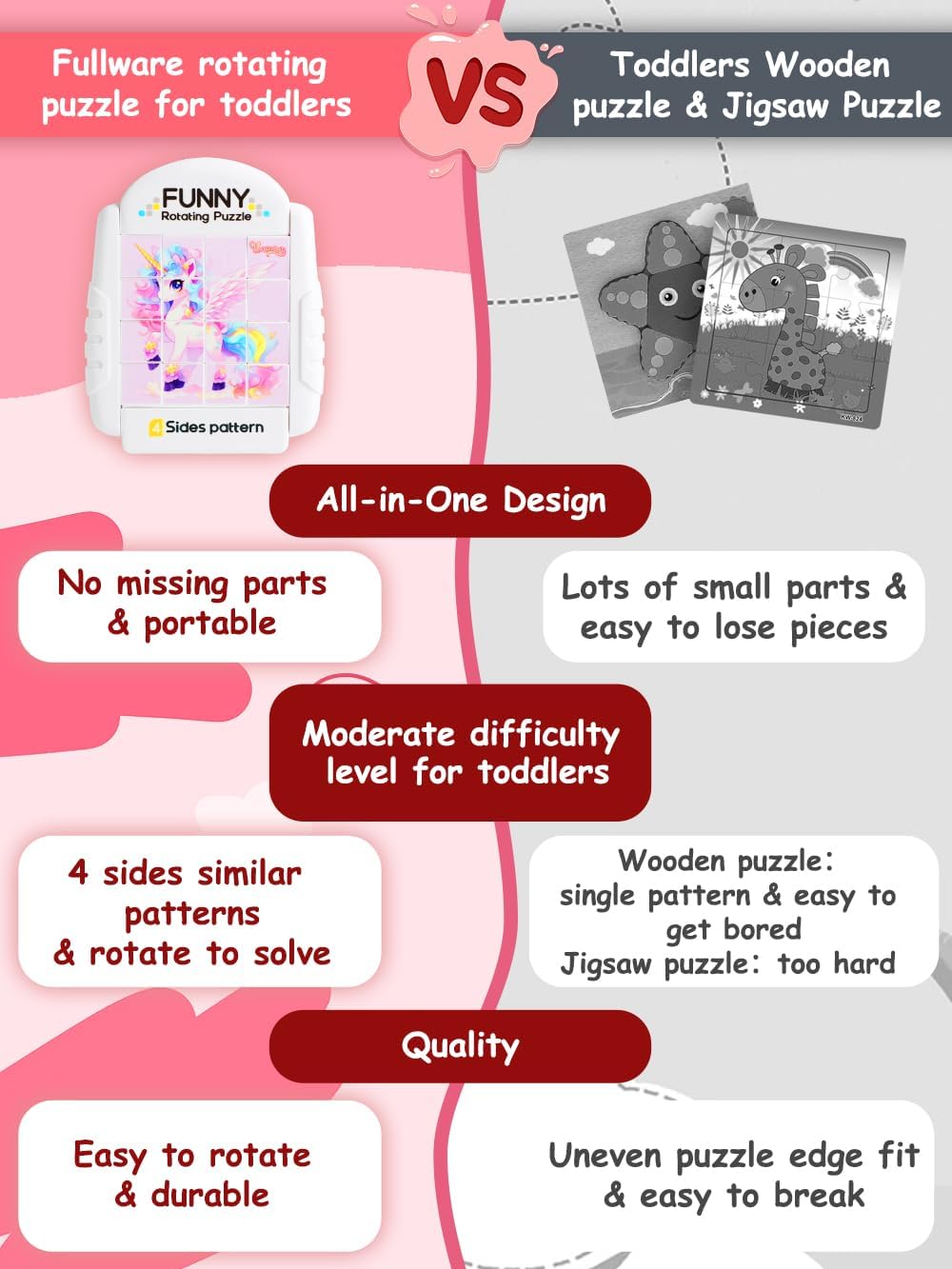 - A HANDY TOY FOR OUTINGS - Whether in the car or at a restaurant, our compact Rotating Puzzles can be carried along and keep children quiet and occupied. Moreover, there is no risk of missing pieces after playing with this all-in-one design puzzle!