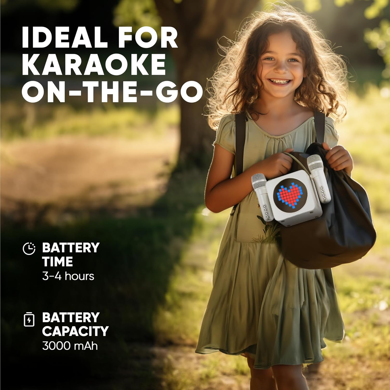 - 【Extended playtime & battery life】- Experience endless joy and power up for hours of karaoke fun with the Animato S1 impressive 3-4 hour battery life. Designed for those who love to sing, you can conveniently charge it using the provided cable. Its sleek, compact design paired with an integrated carry strap ensures you can take your music on the move. Whether you're at a party, a picnic, or just lounging at home, always be ready for a spontaneous karaoke moment and l