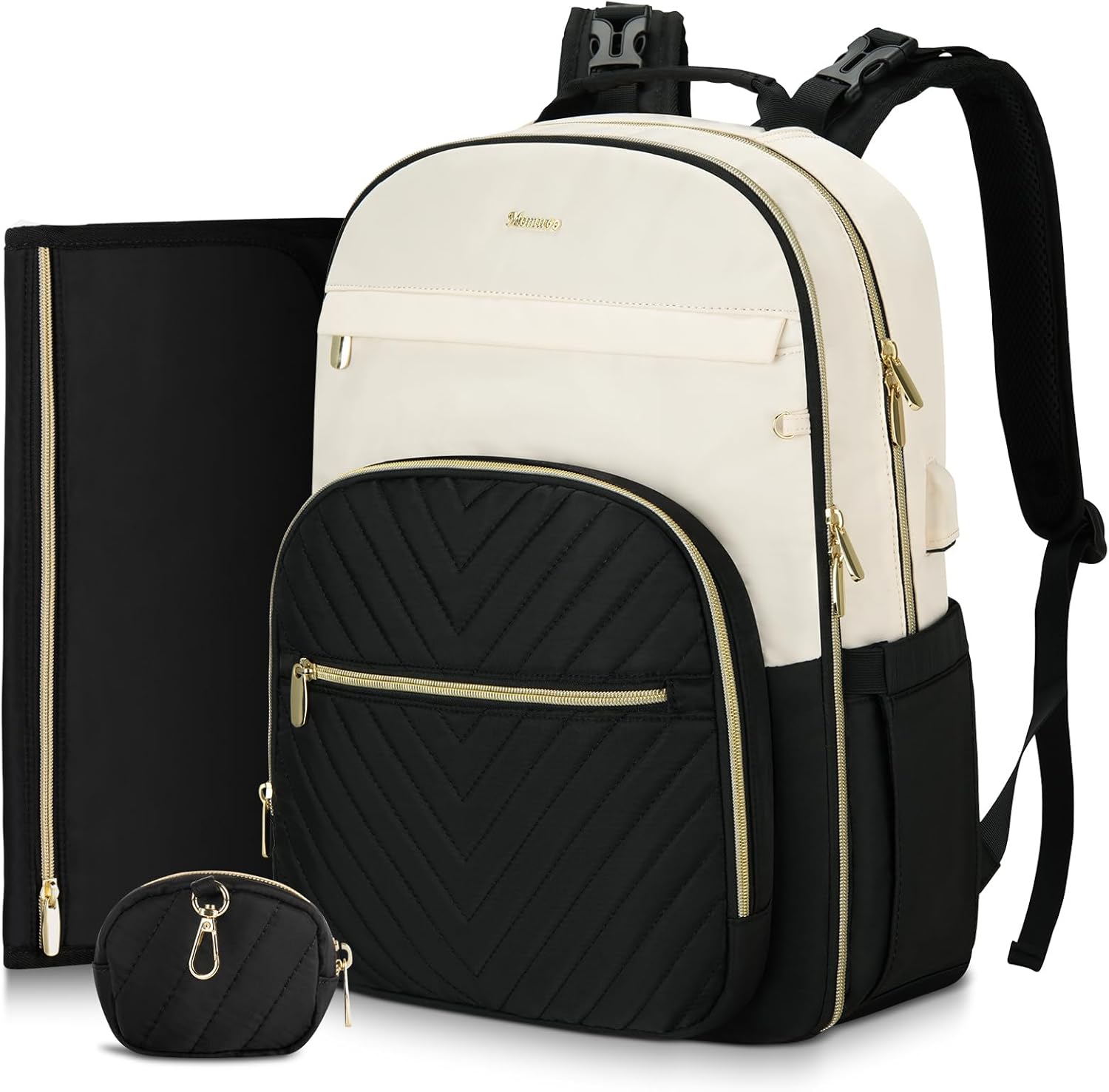 - Convenient and Thoughtful: Baby diaper bag features 15.6ββ padded laptop pocket and 12.9ββ iPad pocket in the main compartment, USB charging port, 2 built-in stroller straps, waterproof pocket, back anti theft pocket, dual zippers for easy access and closure even with one hand! Also we have added a luggage sleeve on the back so it can easily slide over a carryon luggage while on the go.