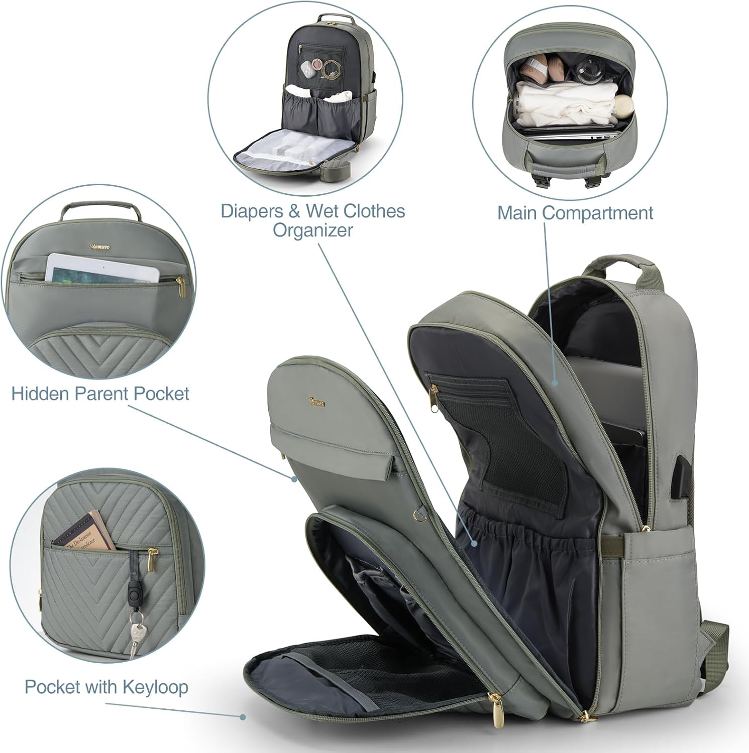 - Convenient and Thoughtful: Baby diaper bag features 15.6ββ padded laptop pocket and 12.9ββ iPad pocket in the main compartment, USB charging port, 2 built-in stroller straps, waterproof pocket, back anti theft pocket, dual zippers for easy access and closure even with one hand! Also we have added a luggage sleeve on the back so it can easily slide over a carryon luggage while on the go.