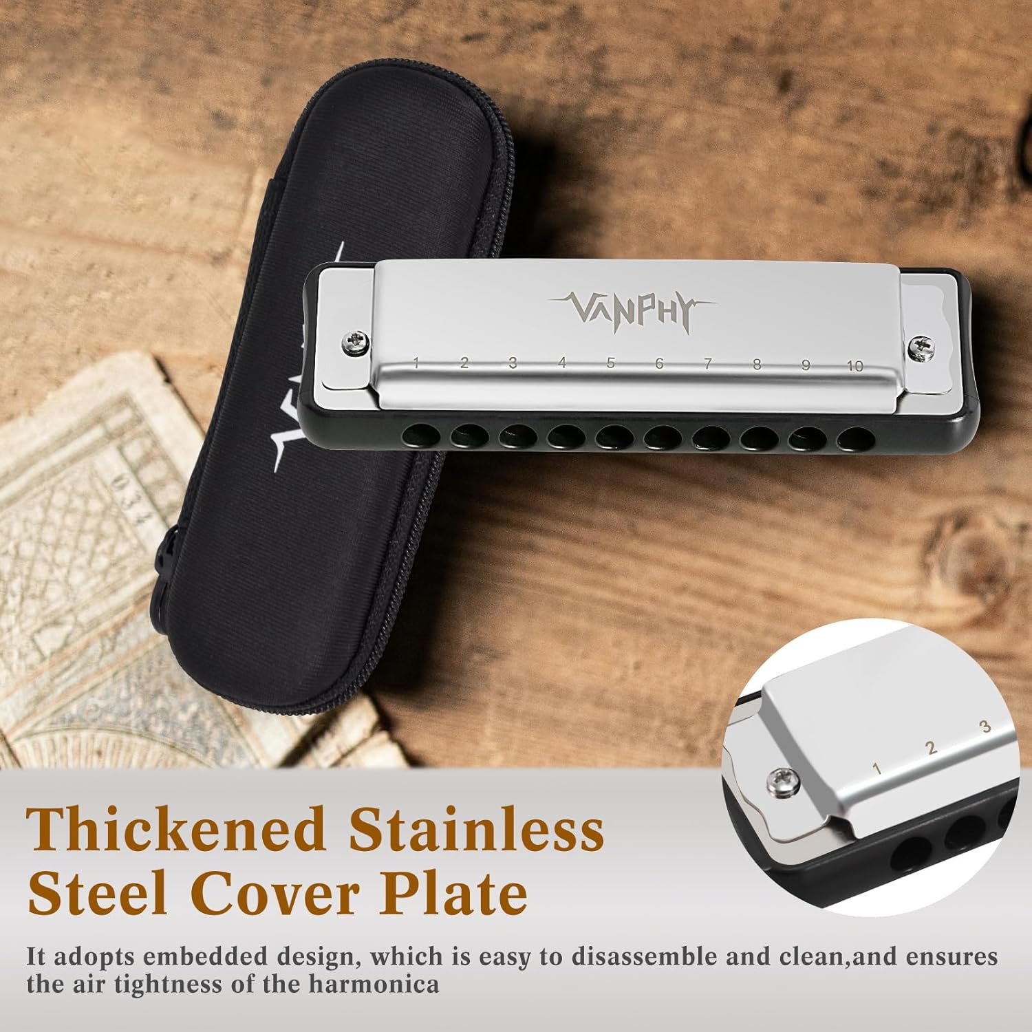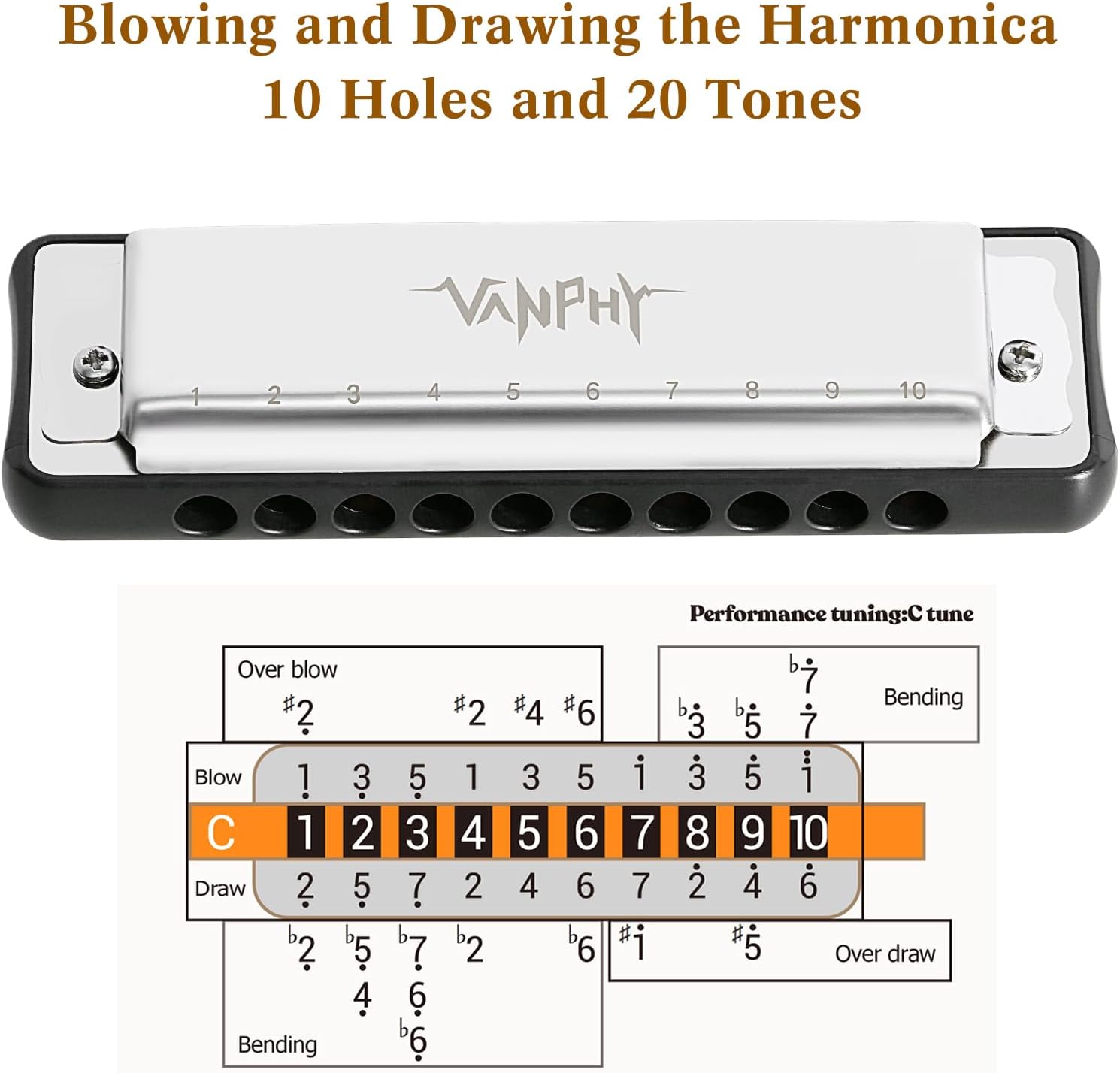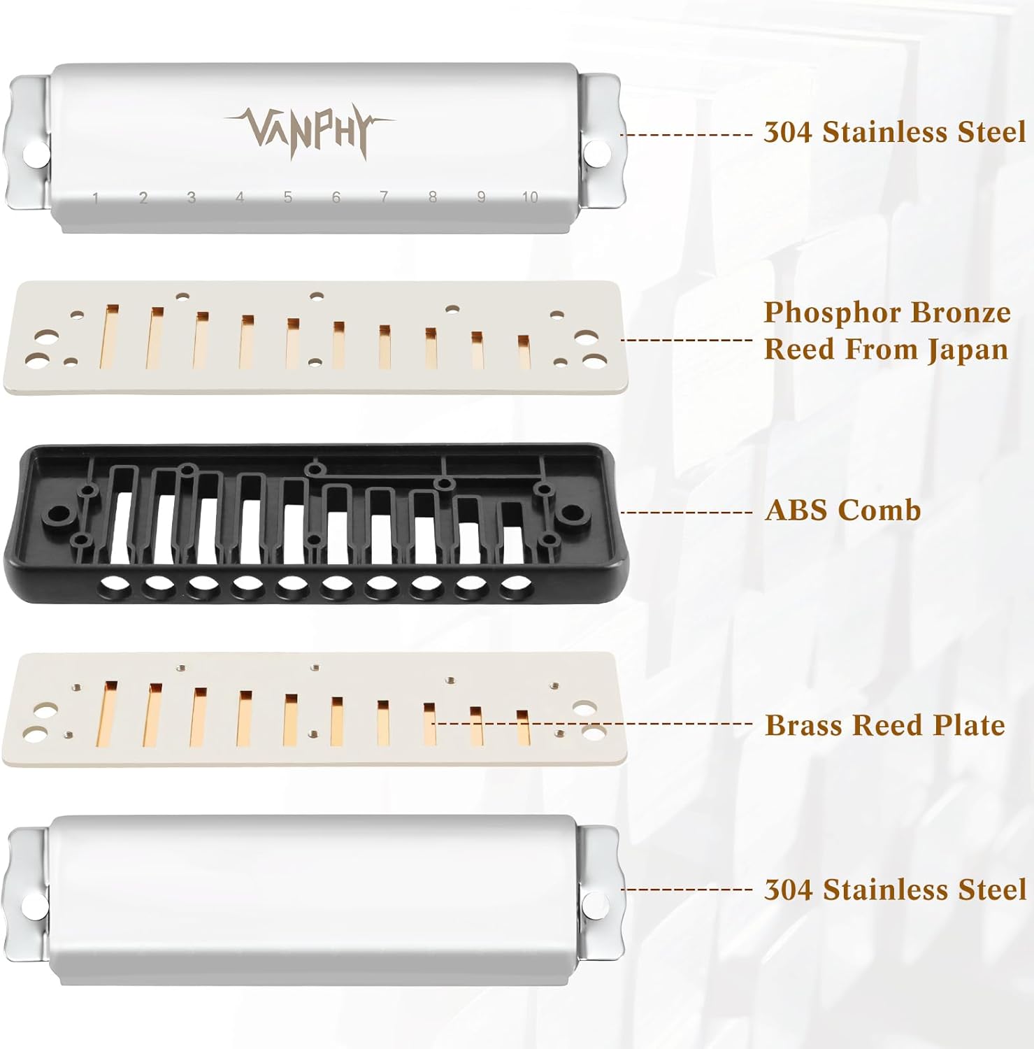 - High Quality Raw Materials: VANPHY harmonica selects high-quality phosphor bronze reeds and 1.2mm thick reeds, which ensures the clarity and penetration of the sound, and also makes playing more labor-saving. The fret is made of ABS material, which makes you feel more at ease when playing