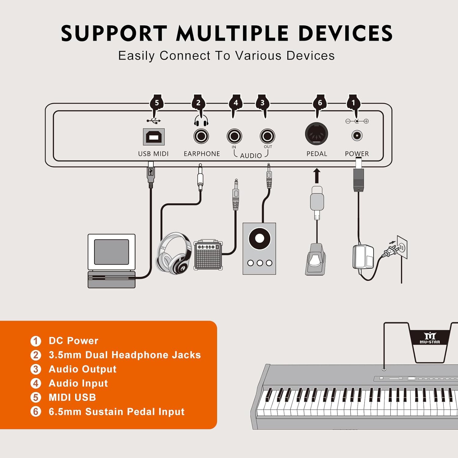 - READY TO GO ANYWHERE - Constructed with MDF material piano body, MUSTAR 88 key piano keyboard comes with heavy duty double-X shaped stand for extra stability, designed for beginners. The big waterproof padded case allows you to store the keyboard safely. Play anywhere, anytime, without taking up space.