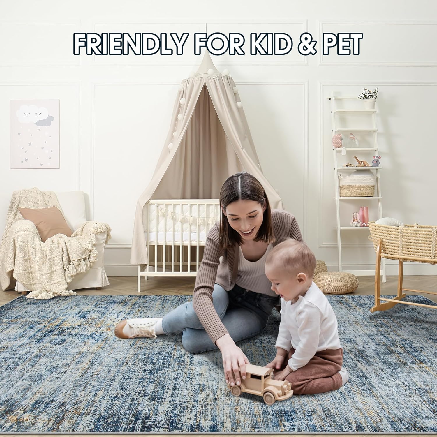 Area Rugs 8x10 Living Room Rugs: Large Modern Abstract Washable Rug with Non-Slip Backing, Thin Carpet for Dining Room Table Bedroom Nursery Indoor Home Office-Blue/Brown