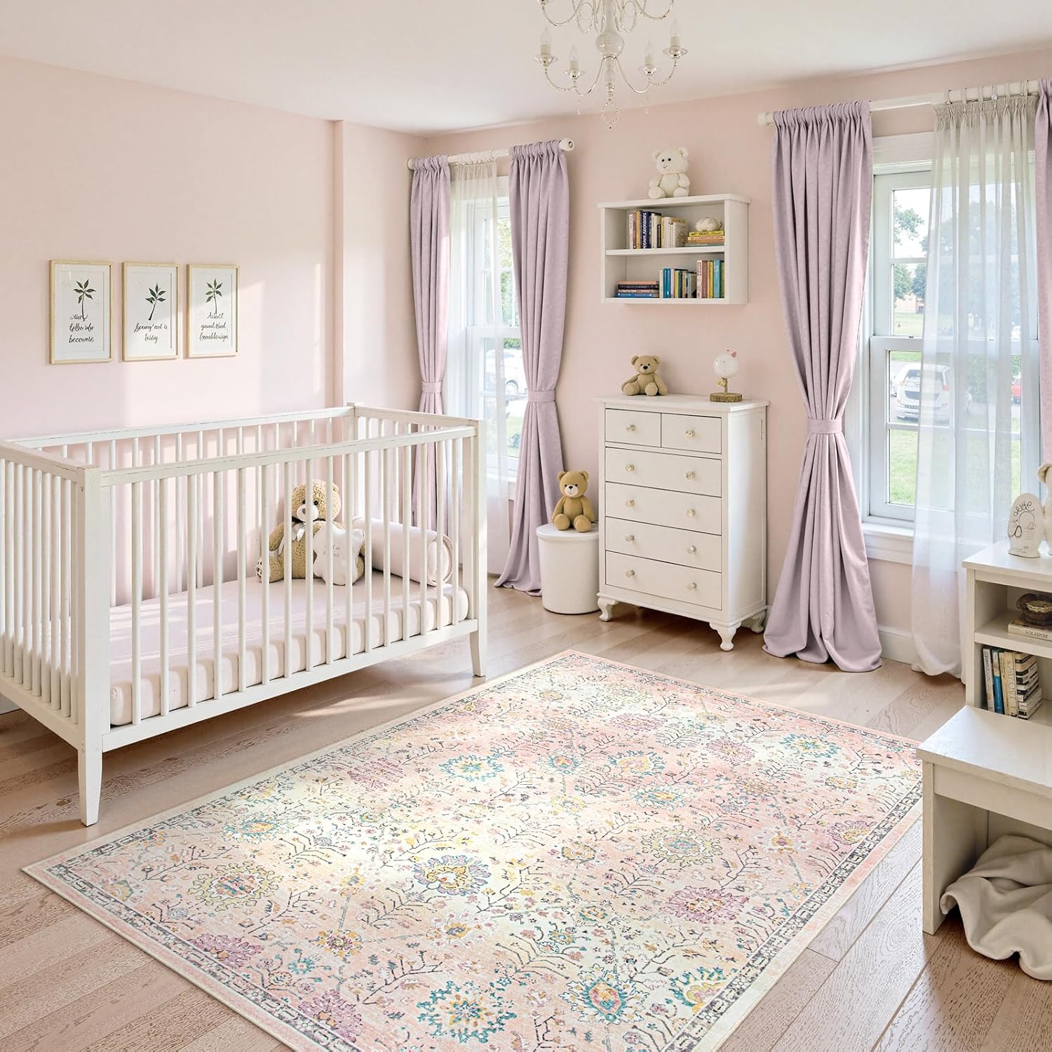 Lahome Pink Boho Area Rug for Nursery, 5x7 Washable Pink Rugs for Bedroom Girls Kids Room Living Room, Floral Pastel Carpet Non Slip for Classroom Playroom Dorm