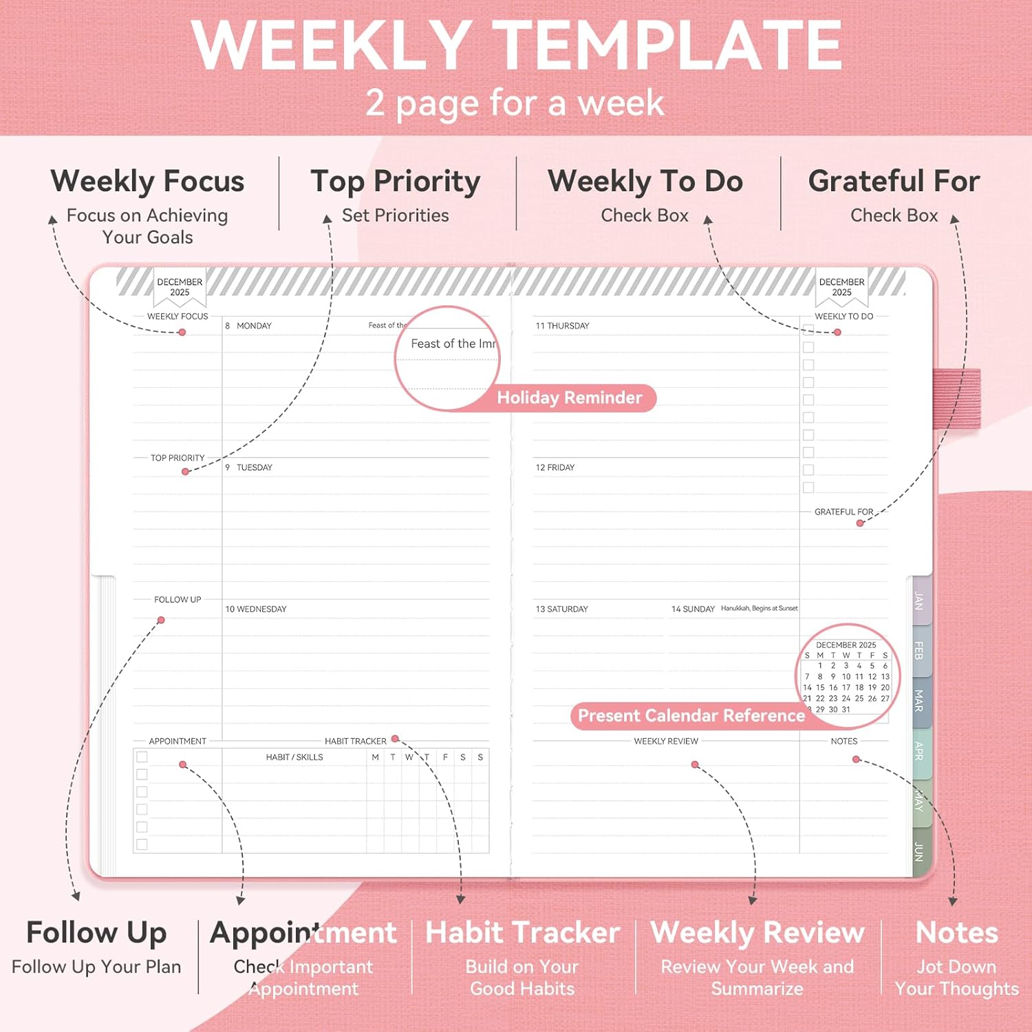 - Monthly Goal Setting: Manage your monthly goals with dedicated pages for objectives, to-do lists, and reviews. Ample space for appointments, plans, and daily tasks keeps your monthly goals within reach.