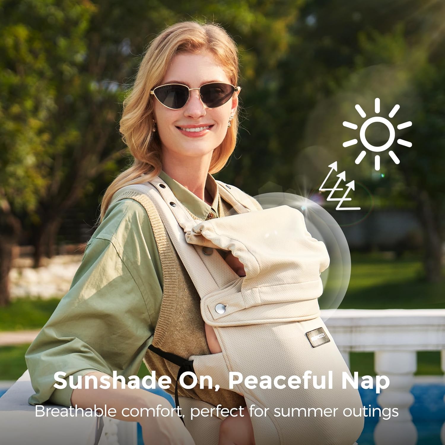 Momcozy Newborn Baby Carrier - Ergonomic, Cozy and Lightweight Carrier for 7-24lbs, Adjustable Neck Support with Sunshield, Breathable Airmesh Perfect for Summer Outing, Khaki