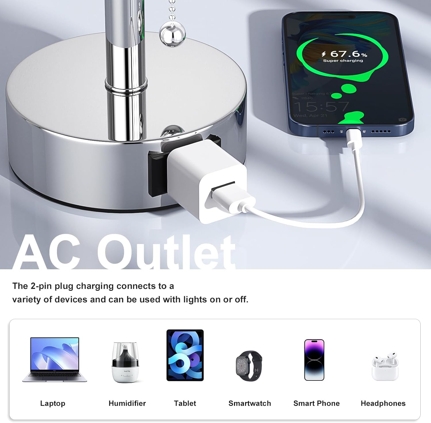 White Silver Bedside Table Lamps Set of 2-3 Color Temperatures Pull Chain Lamp with AC Outlet Charging Port, Two Round Night Stand Lamps for Bedroom, Small Bed Side Light with E26 LED Bulbs